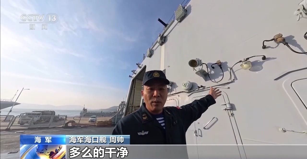 海军海口舰 周帅:大家好,我是周帅,是海口舰的一名战士,刚刚结束了这次远海实战化训练,任务圆满顺利。现在到甲板上带大家一块吹吹海风,感受一下母港的温暖的气息。可以看到,我们起降平台的立壁,多么的干净。