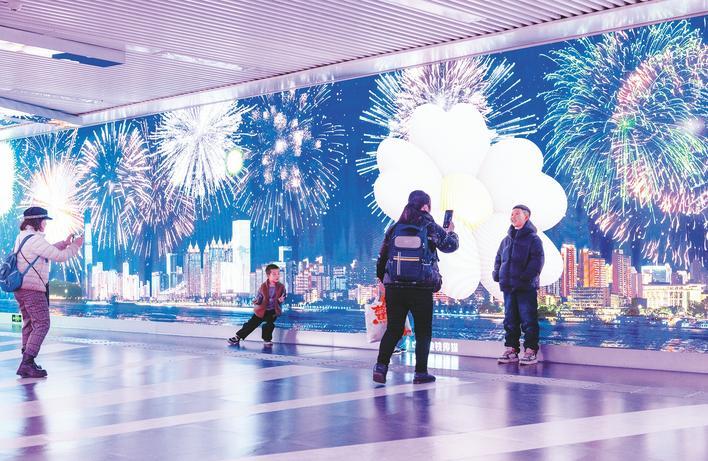 12月29日,武汉地铁街道口站内,显示屏上一会是疾驰而过的地铁动画,一会是满屏的2025新年心愿,吸引不少市民游客驻足拍照打卡。据介绍,这是主题为“烟火武汉”的数字烟花秀,将地铁、樱花、烟花、武汉地标等元素结合起来,展现武汉城市文化。