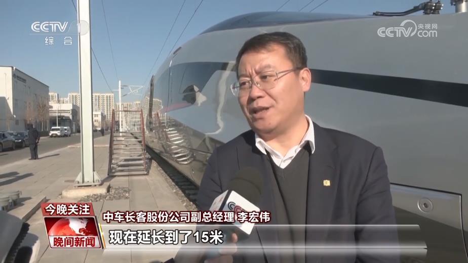 中车长客股份公司副总经理 李宏伟:这个车头是由原来的这个12米5,现在延长到了15米,整个车体的长细比也做了一些调整,主要的目的就是为了降低它的气动阻力。