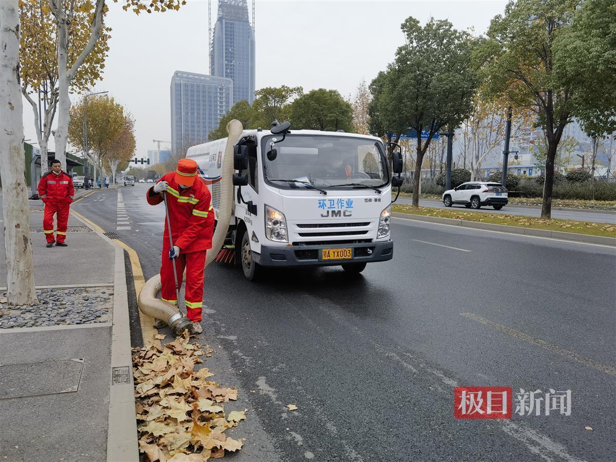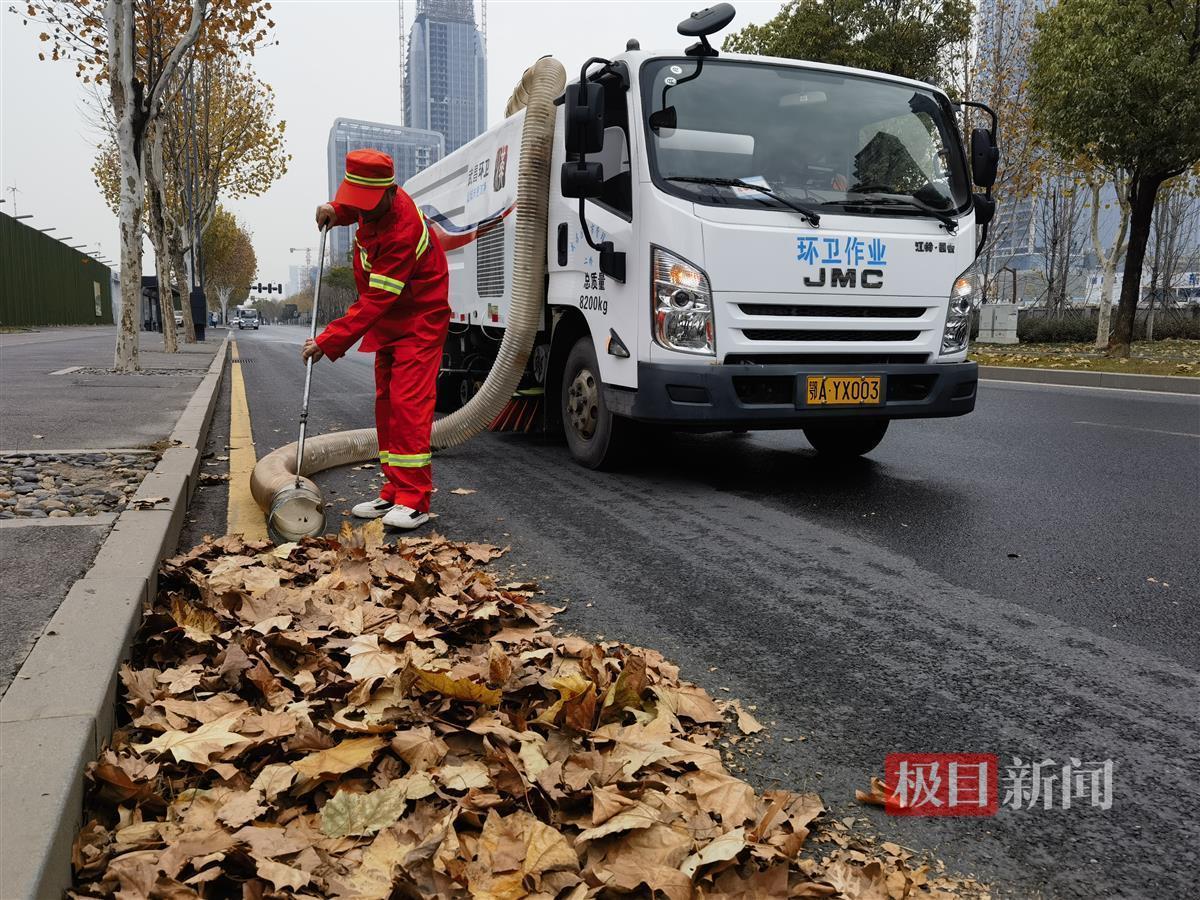 12月30日,在武昌临江大道,只见环卫工人将人行道上的落叶,清扫到人字沟内,这时,一辆背着“长鼻子”的洗扫车开过来,司机李志贤启动吸扫器,副手黄末跳下车,取下“长鼻子”,对着“一”字形落叶,进行吸扫。随着“唦唦”声不断,落叶从透明的“长鼻子”中,吸进了车厢内,清晰可见。