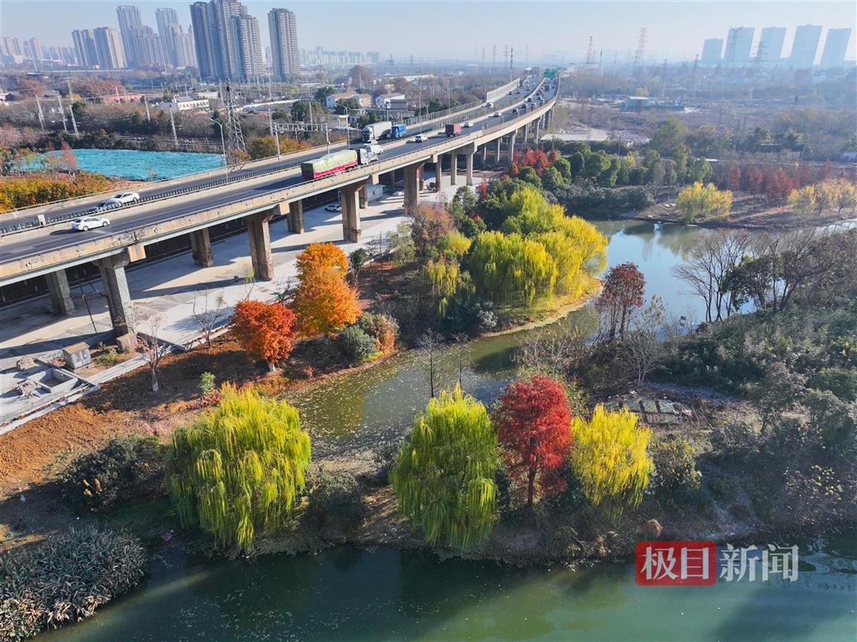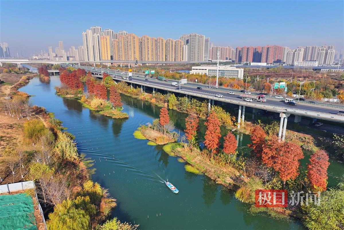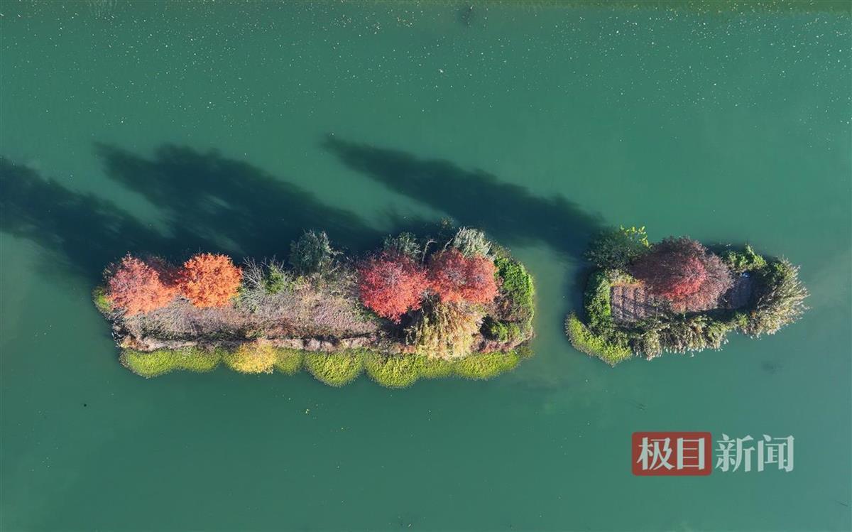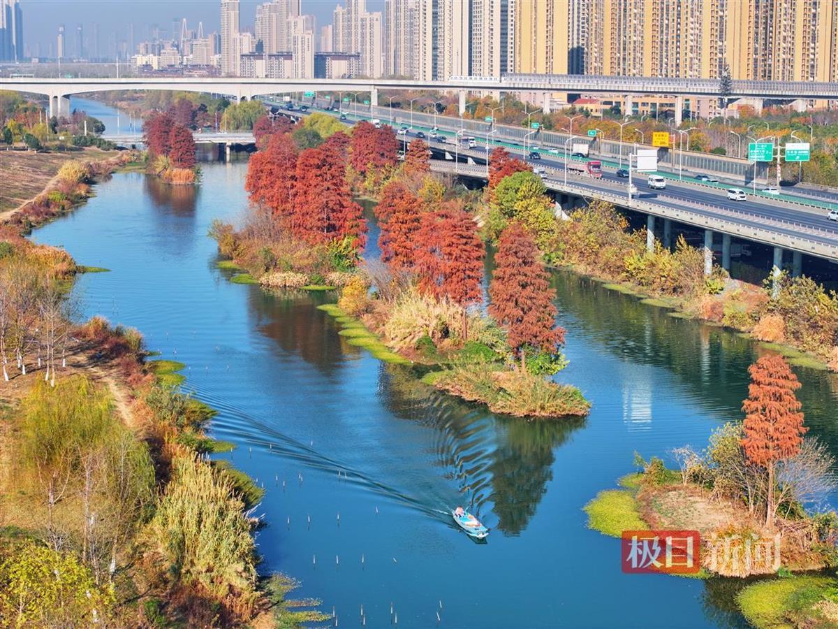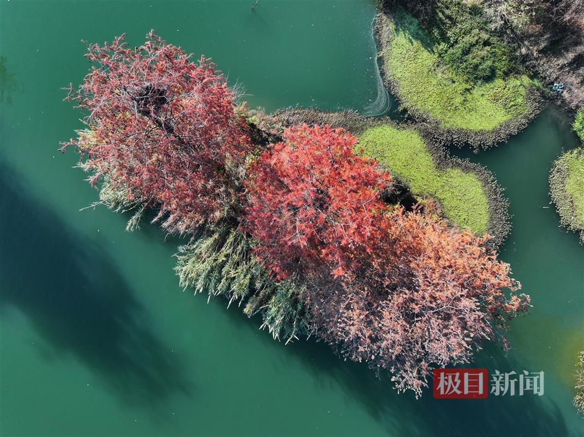 12月29日,俯瞰武汉市洪山区青菱湿地,近二十株杉树换上“红装”,生态浮岛上已被郁郁葱葱的水生植物覆盖,蜿蜒近2公里的河道水清岸绿,俨然一片炫彩“水上森林”。