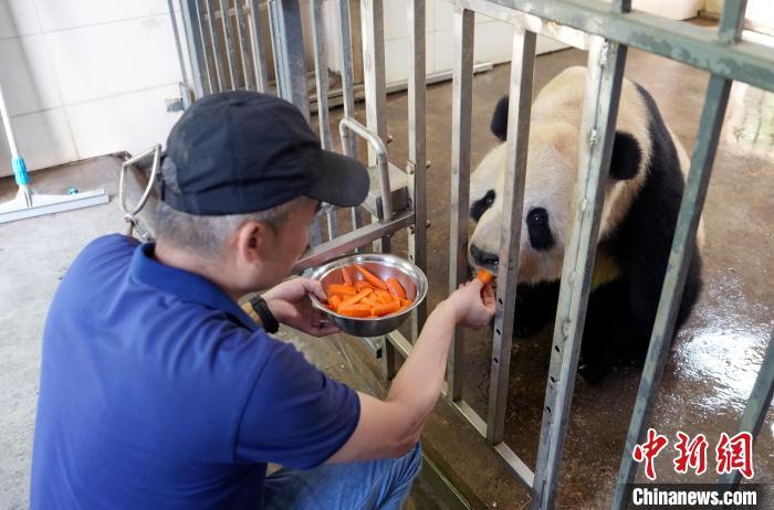 大熊猫作为“球宠”,是备受世界人民喜爱的珍稀濒危野生动物,也是传递中国人民友谊的友好使者。20世纪90年代以来,中国先后与20个国家的26个机构开展了大熊猫国际保护合作研究,对国外公众进一步了解中国大熊猫等野生动植物保护成效、生态文明建设成就及增进中外民间友好发挥了重要作用。到期到龄的旅外大熊猫陆续返回中国后,多数生活在中国大熊猫保护研究中心等机构。每只“海归”大熊猫都会有一份根据其性格特点制定的管理方案,在饲养员的精心照顾下,它们回家后过上了更美好的生活。图为7月5日,中国大熊猫保护研究中心都江堰基地饲养师唐勇在给大熊猫“添添”喂胡萝卜。大熊猫“添添”,雄性,1997年8月27日出生于中国大熊猫保护研究中心卧龙核桃坪基地,2000年12月6日旅居美国华盛顿国家动物园,并于2023年11月9日返回中国。中新社记者 安源 摄