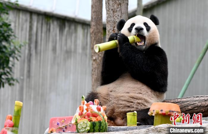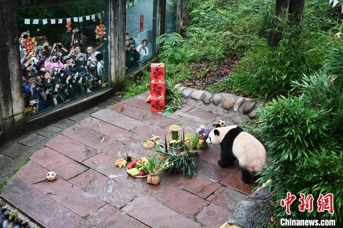 大熊猫作为“球宠”,是备受世界人民喜爱的珍稀濒危野生动物,也是传递中国人民友谊的友好使者。20世纪90年代以来,中国先后与20个国家的26个机构开展了大熊猫国际保护合作研究,对国外公众进一步了解中国大熊猫等野生动植物保护成效、生态文明建设成就及增进中外民间友好发挥了重要作用。到期到龄的旅外大熊猫陆续返回中国后,多数生活在中国大熊猫保护研究中心等机构。每只“海归”大熊猫都会有一份根据其性格特点制定的管理方案,在饲养员的精心照顾下,它们回家后过上了更美好的生活。图为9月13日,游客在中国大熊猫保护研究中心雅安碧峰峡基地为大熊猫“香香”庆祝生日。大熊猫“香香”,雌性,2017年6月12日出生于日本上野动物园。中新社记者 安源 摄