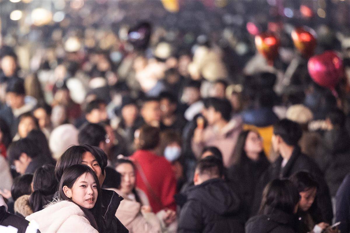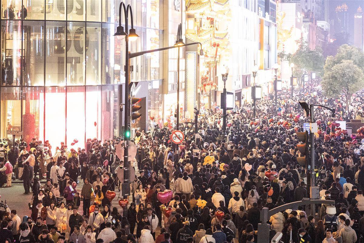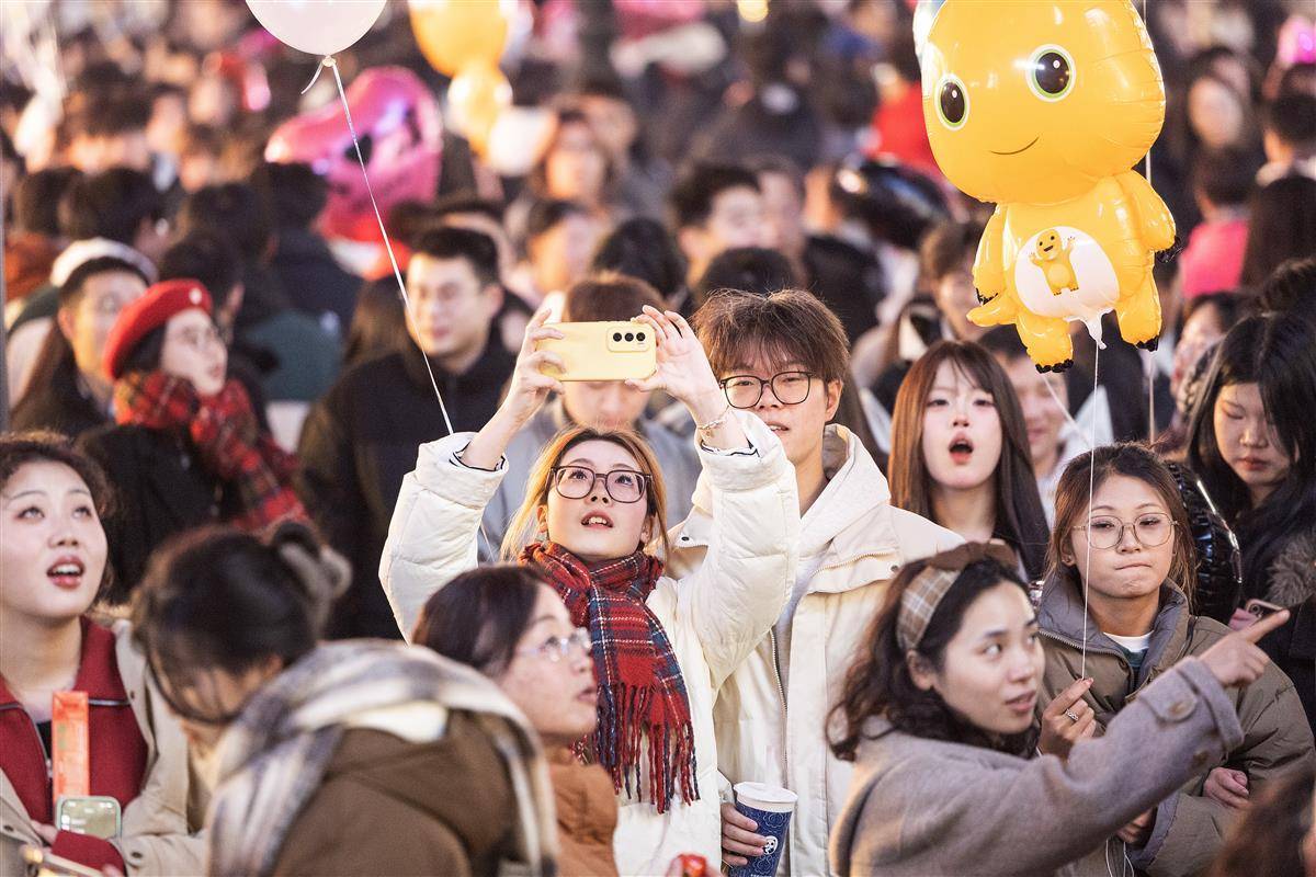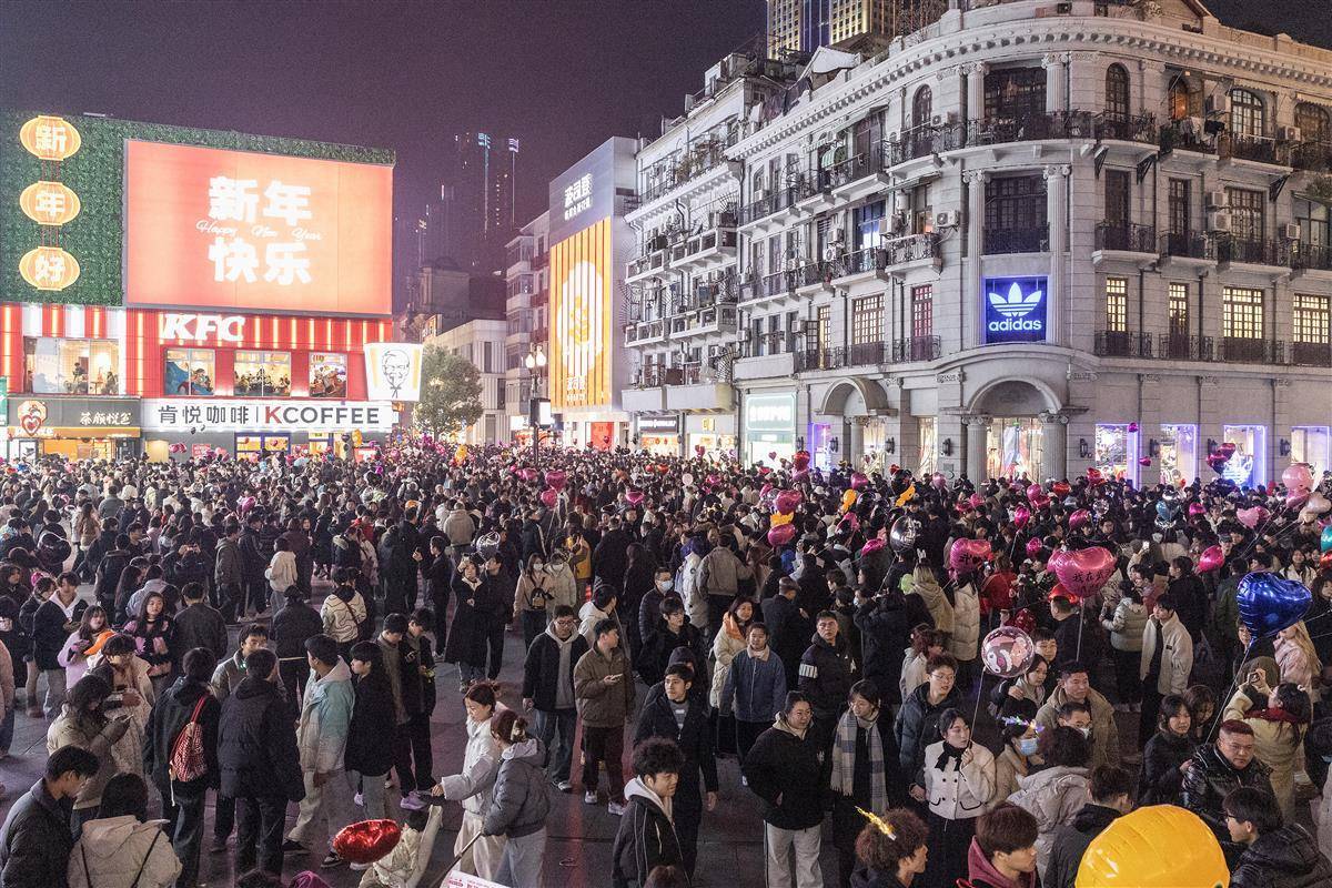12月31日晚,武汉市江汉路步行街灯光璀璨,霓虹灯五彩斑斓,人们从四面八方涌向这里,共同等待新年的到来。小贩的叫卖声、孩子们的欢笑声交织在一起,充满了“烟火气”,让人感受到了这座城市的活力和热情。 (湖北日报全媒记者 任勇 摄)
