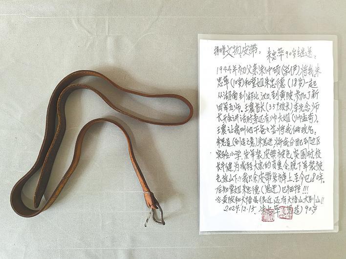 2024年12月15日,湖北革命军事馆筹建办公室在北京开展新四军第五师和中原突围革命文物(实物)征集活动。活动中,90岁高龄的新四军第五师老战士朱忠荜捐出一条保存了近80年的皮带。