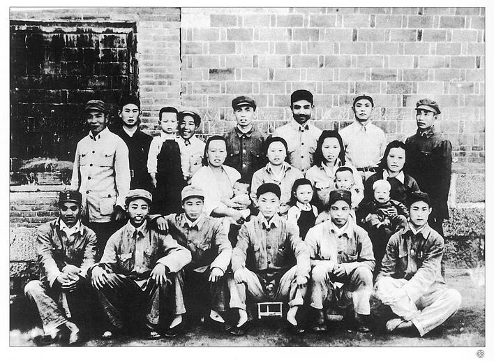 1945年,李先念(后排左七)、郑位三(后排左六)、陈少敏(后排左四)和新四军第五师部分同志在大悟白果树湾师部合影。(选自李先念画册)