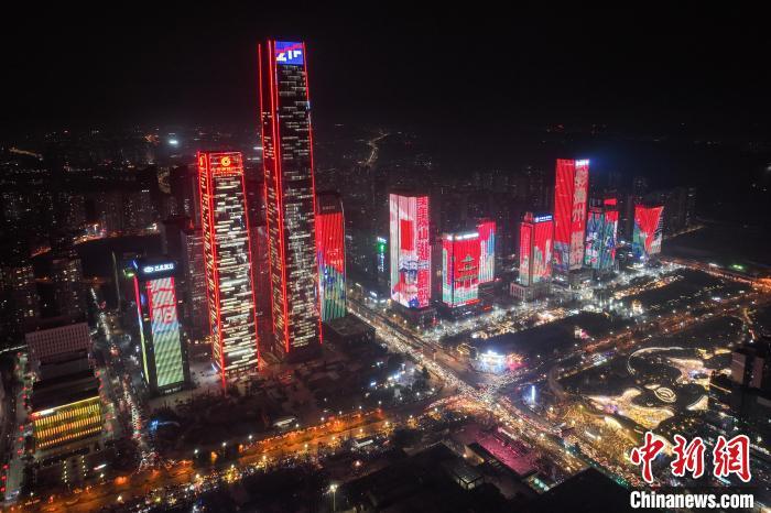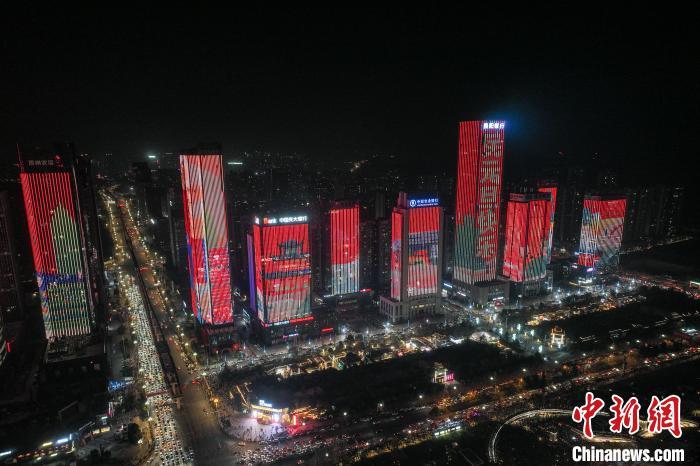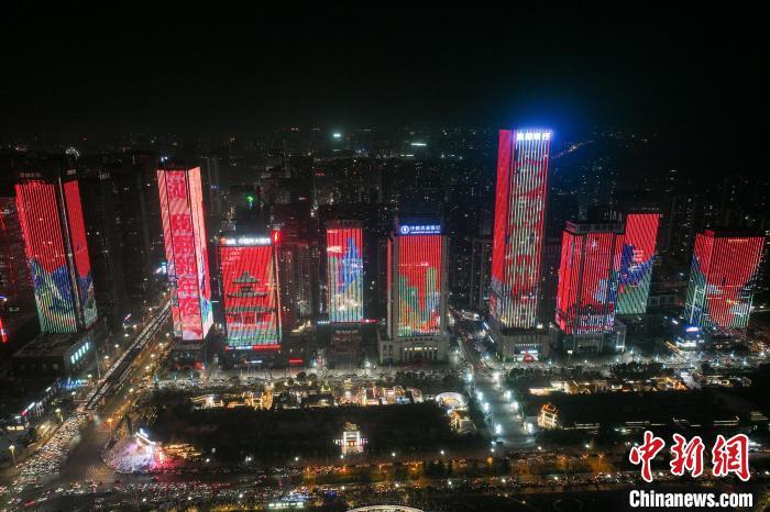12月31日晚,贵州省贵阳市观山湖区金融城部分楼宇幕墙上演灯光秀,迎接2025年的到来。(无人机照片)中新社记者 瞿宏伦 摄