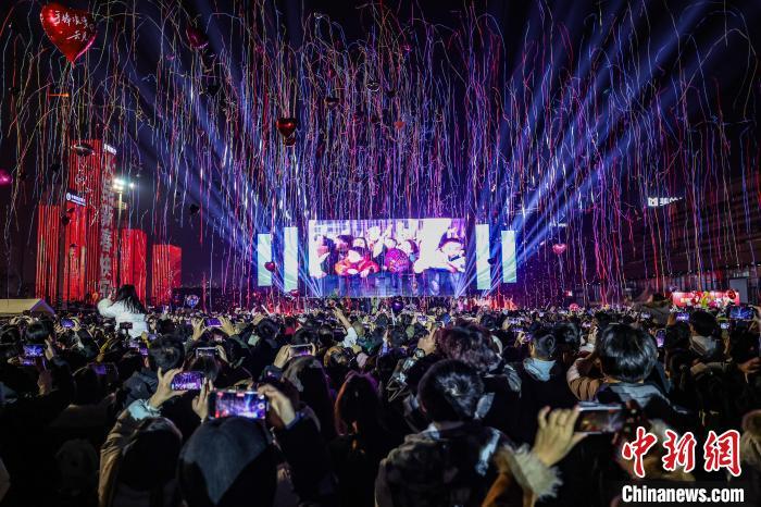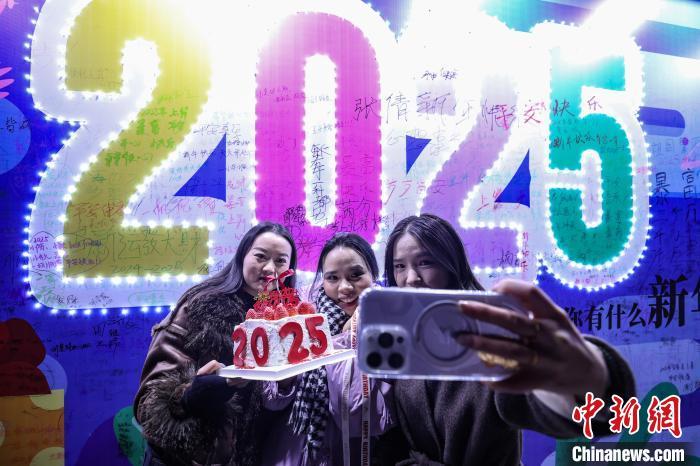 12月31日晚,2025贵阳路边音乐会跨年嘉年华在贵州省贵阳市观山湖区举行,吸引众多游客与市民前来参与,迎接2025年的到来。图为市民手拿2025年字样蛋糕自拍。中新社记者 瞿宏伦 摄