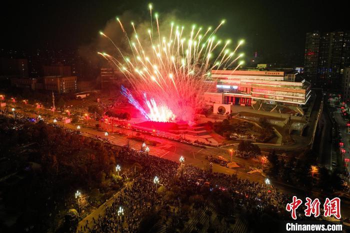 1月1日,2025贵阳路边音乐会跨年嘉年华在贵州省贵阳市观山湖区举行,吸引众多游客与市民前来参与,迎接2025年的到来。图为跨年烟花秀。(无人机照片)中新社记者 瞿宏伦 摄