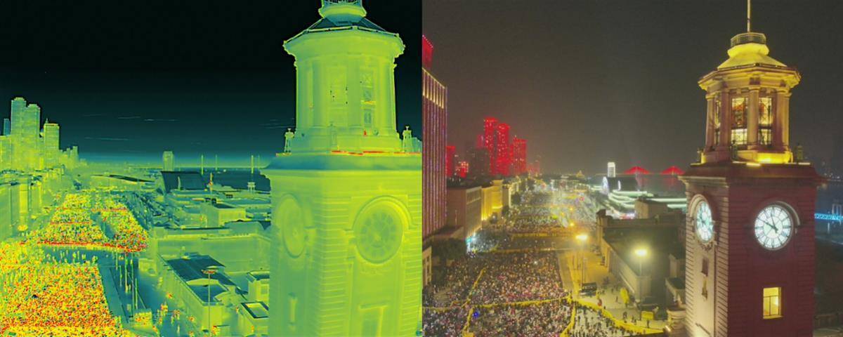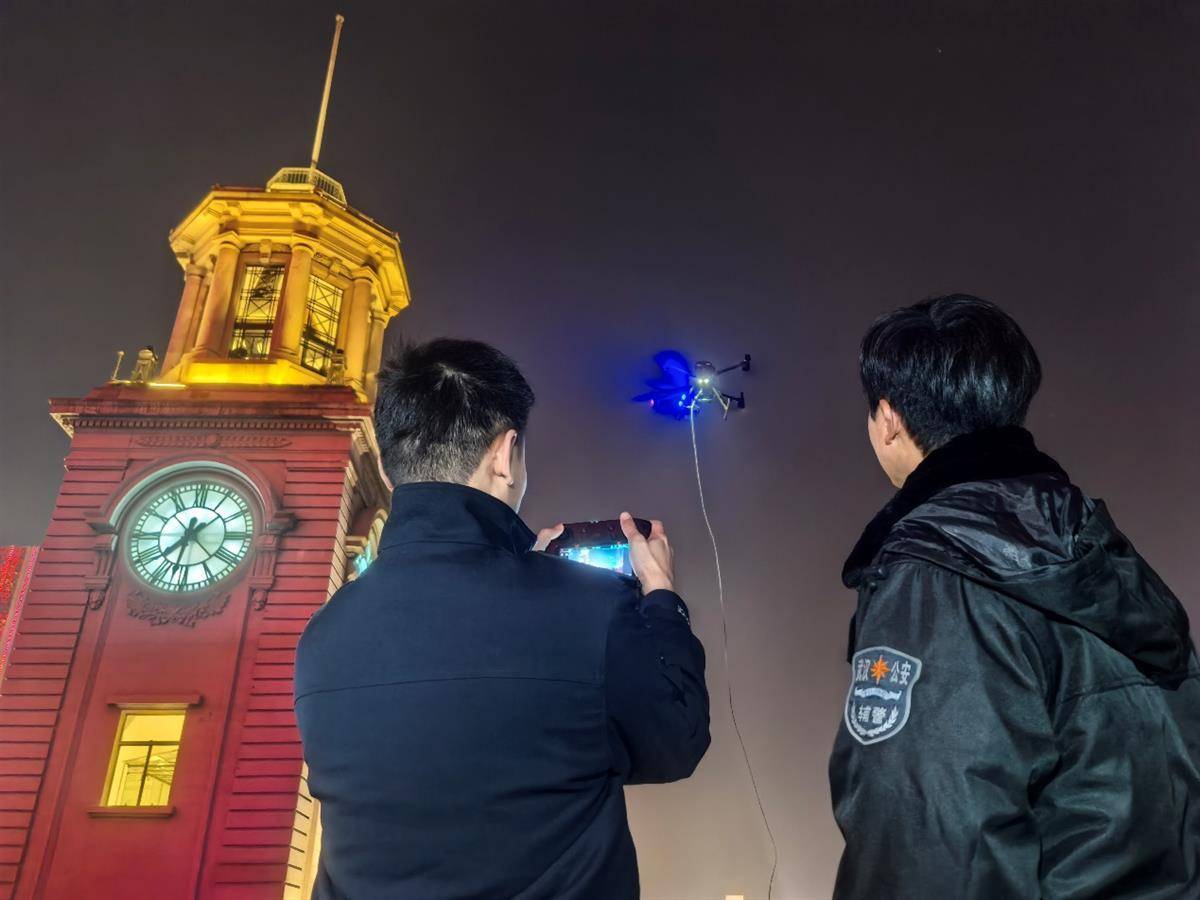 “10,9,8……3,2,1”当江汉关跨年钟声敲响,现场十余万市民一起倒数庆祝2025新年快乐时,视侦支队无人机大队副大队长刘宇飞和辅警张玉泉使用“空中鹰眼”警用无人机开展空中巡逻,利用搭载的红外热成像和变焦双光镜头守护市民平安。值得一提的是,本次使用的系留无人机可实现长航时悬停,解决了传统无人机需要更换电池的痛点。