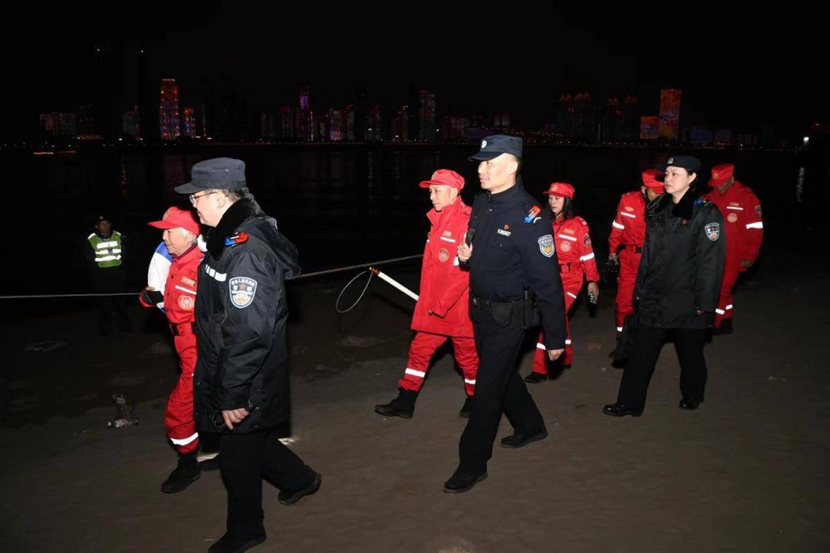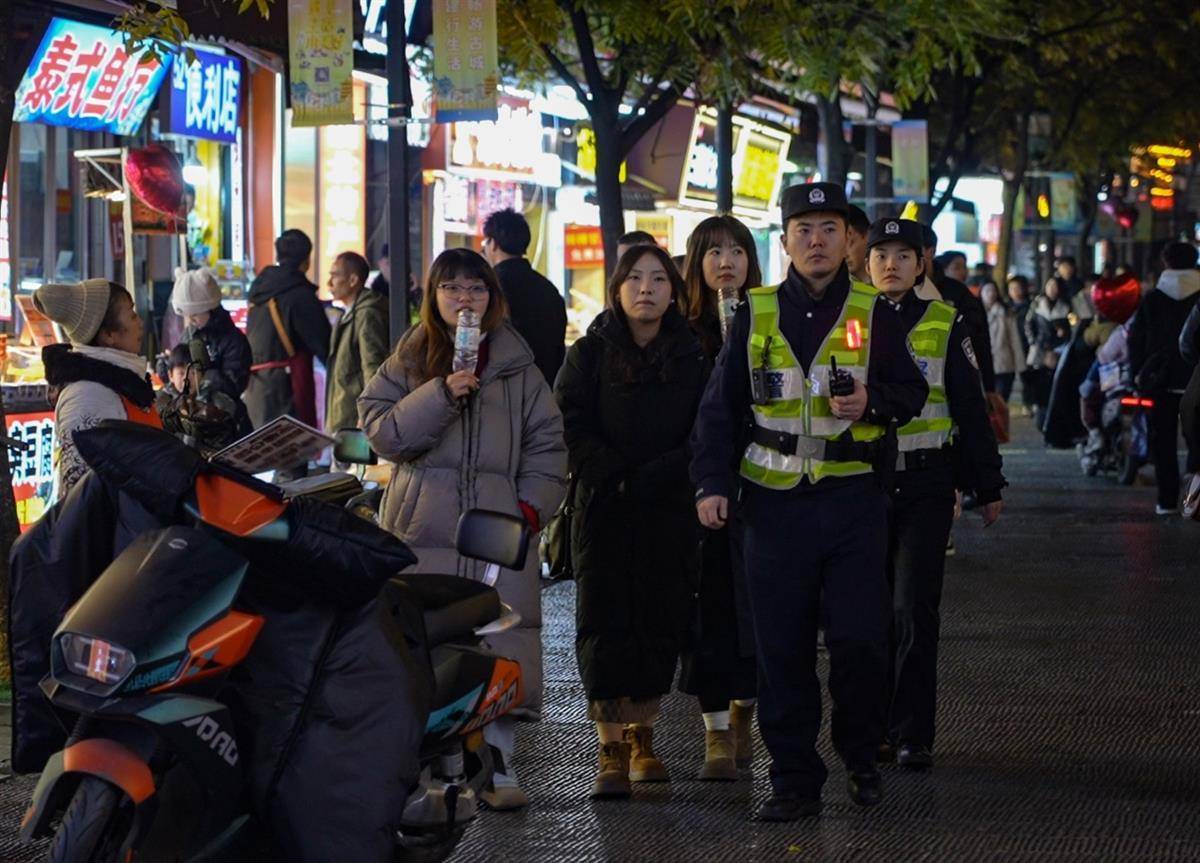 当晚,两岸灯光秀也吸引了无数市民游客驻足观看。长江大桥下,户部巷、斗级营等网红打卡处人流如梭,市民在此聚集,等待新年的钟声敲响。中华路派出所副所长全抱龙在户部巷执勤,为数十位游客充当了“警色导游”,指引方向。