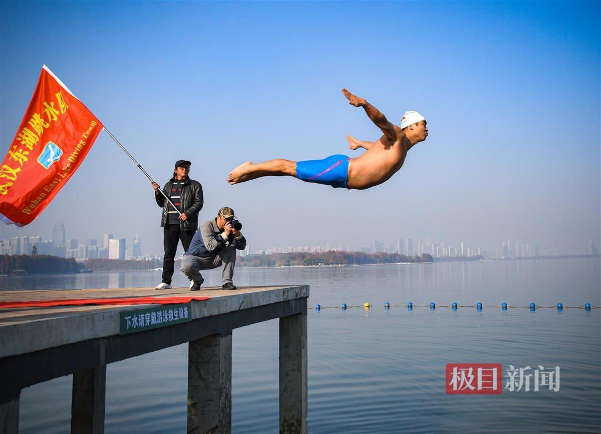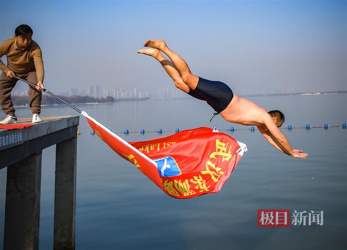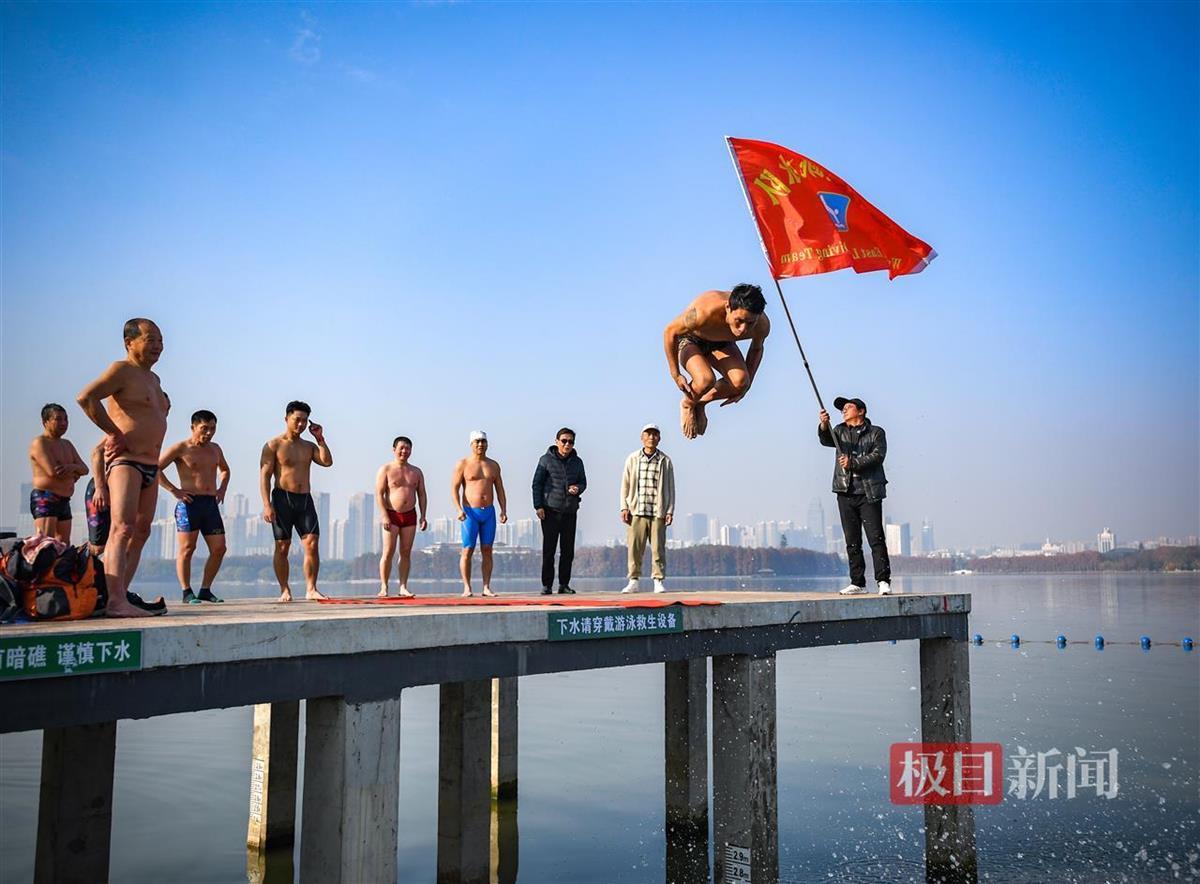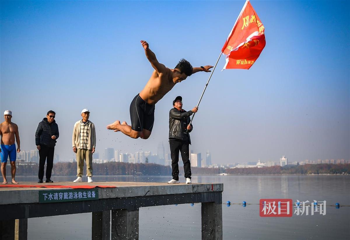 元月1日,武汉东湖凌波门迎来了一场别开生面的新年活动。一群勇敢的跳水爱好者,选择以跳东湖的方式,挑战严寒,庆祝新年的到来。
