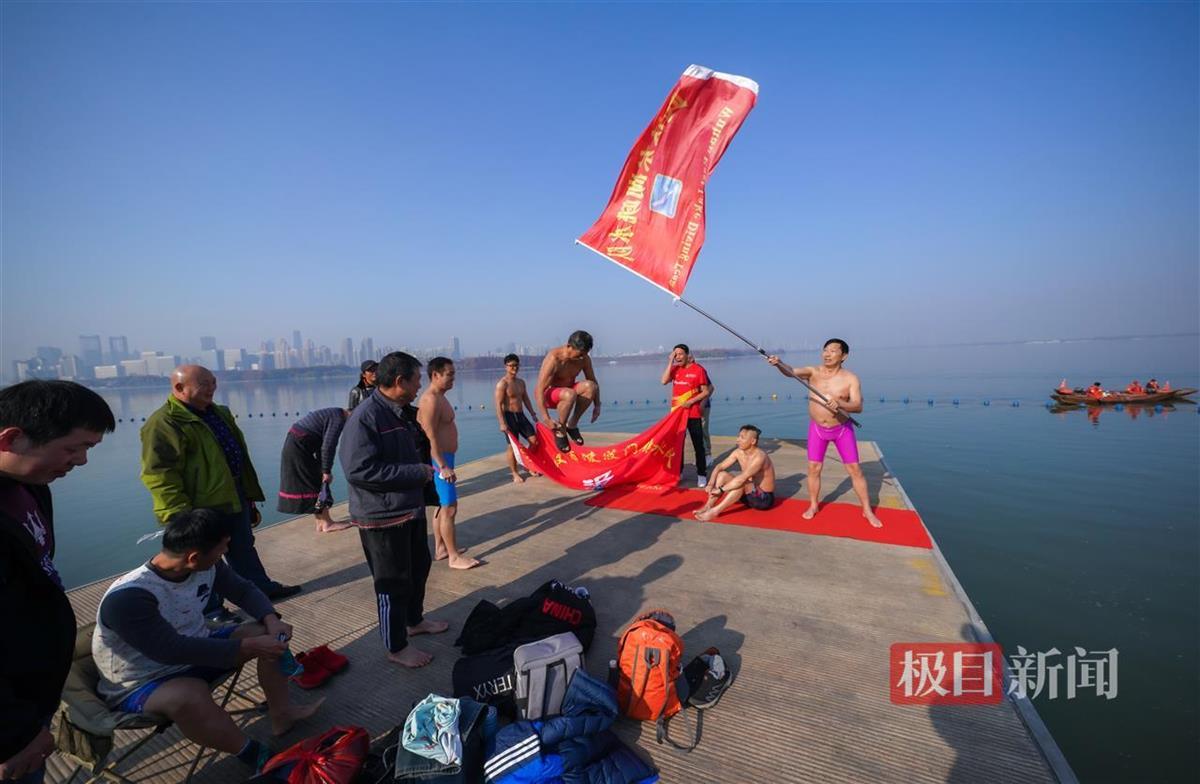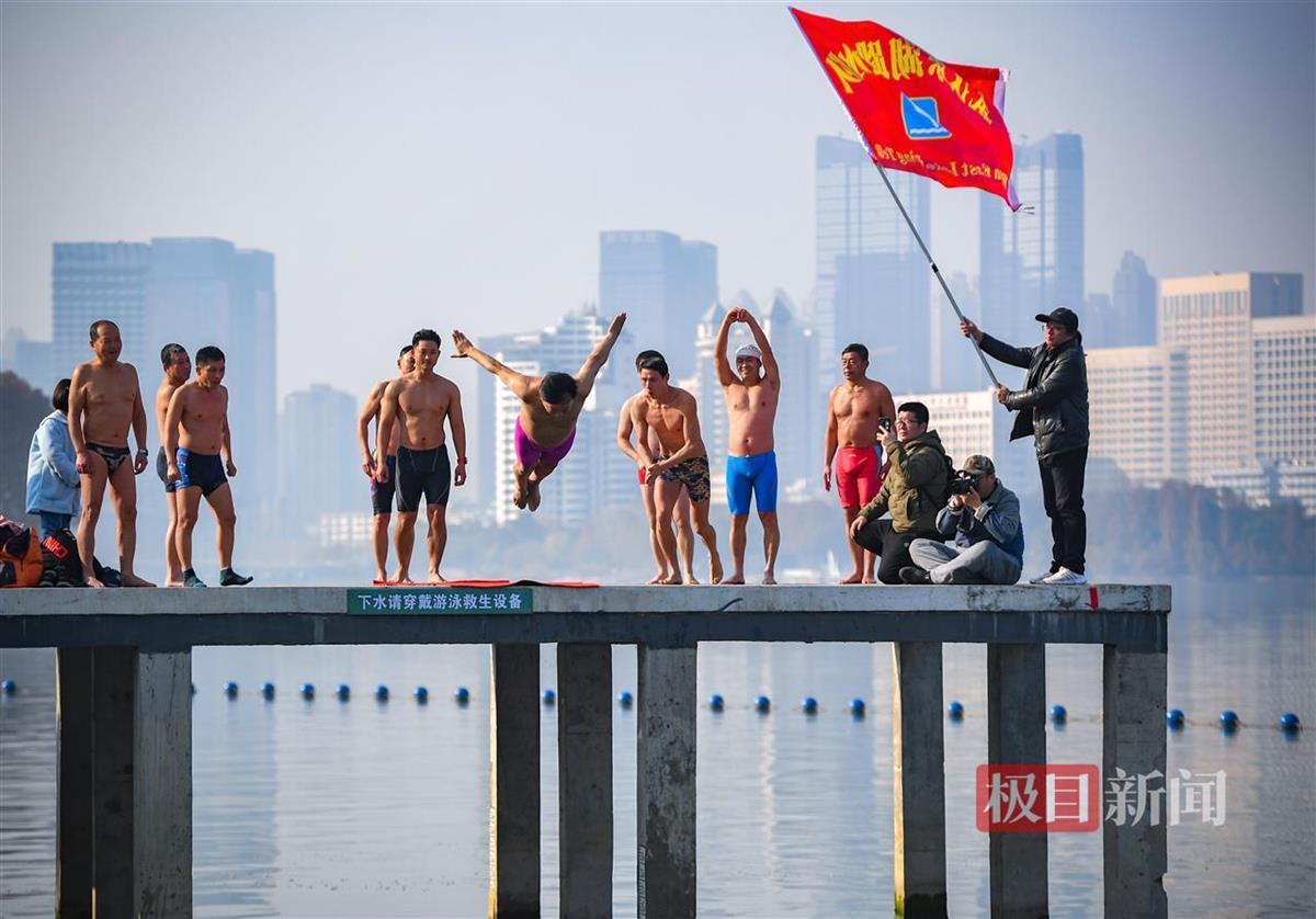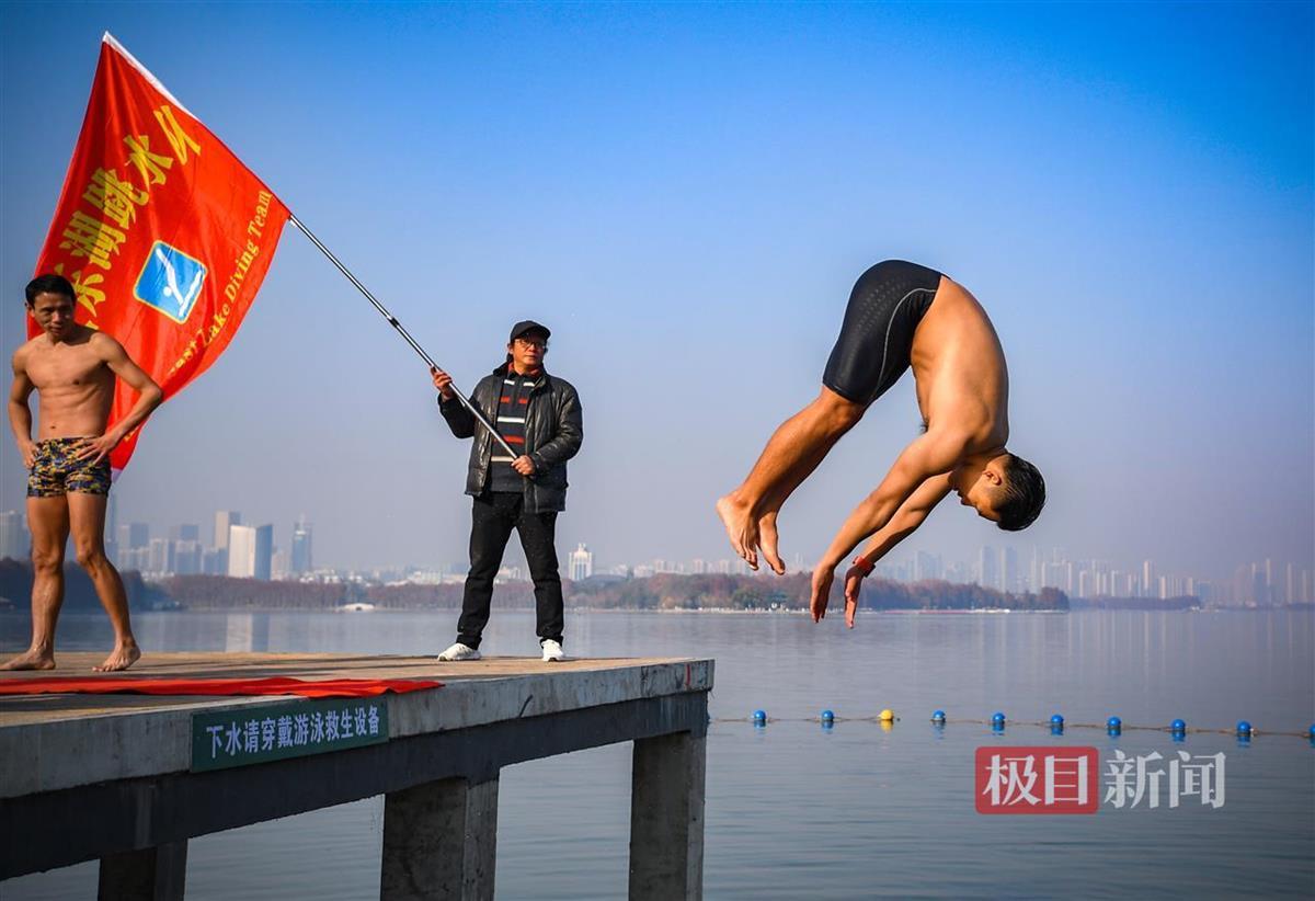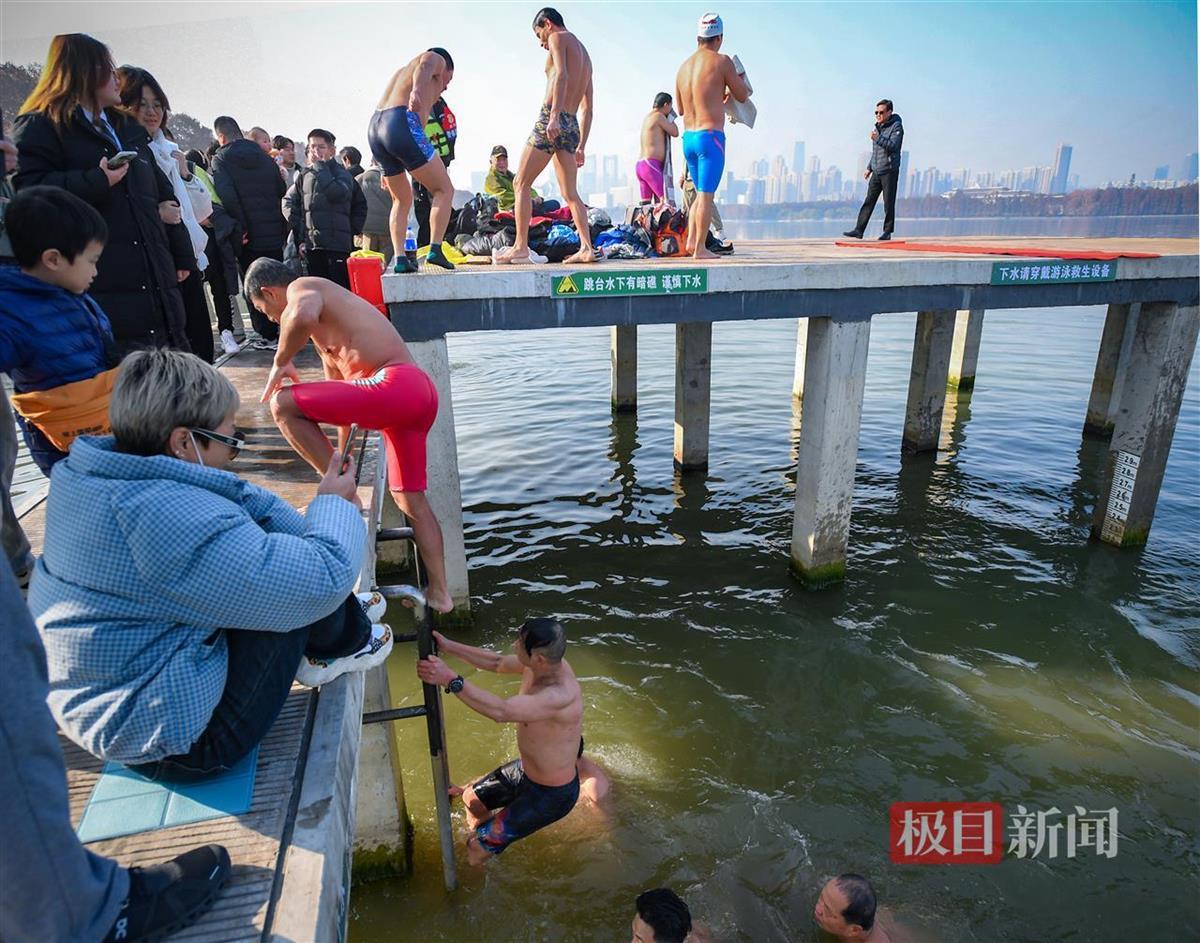 元月1日,武汉东湖凌波门迎来了一场别开生面的新年活动。一群勇敢的跳水爱好者,选择以跳东湖的方式,挑战严寒,庆祝新年的到来。