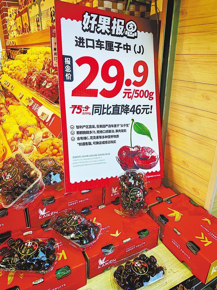 “前天买了2斤,今天再买3斤。价格降了,敞开吃!”元旦假日,武汉市民黄女士去郊游,特意买一盒进口车厘子带上。她说,这一季的车厘子便宜,可以大饱口福。