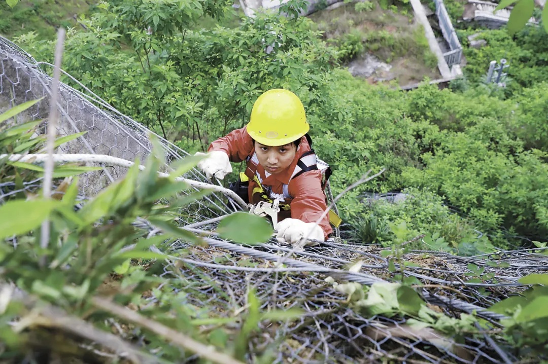 有多难?由于地质条件特殊,不同于一般的骨架式防护,黄杜岩隧道外裹了一层柔性主动防护网。网面柔软,缺乏支撑点。作业时,王俊只能靠手攀住防护网上的钢丝圈,身体紧贴峭壁,才能勉强维持平衡。