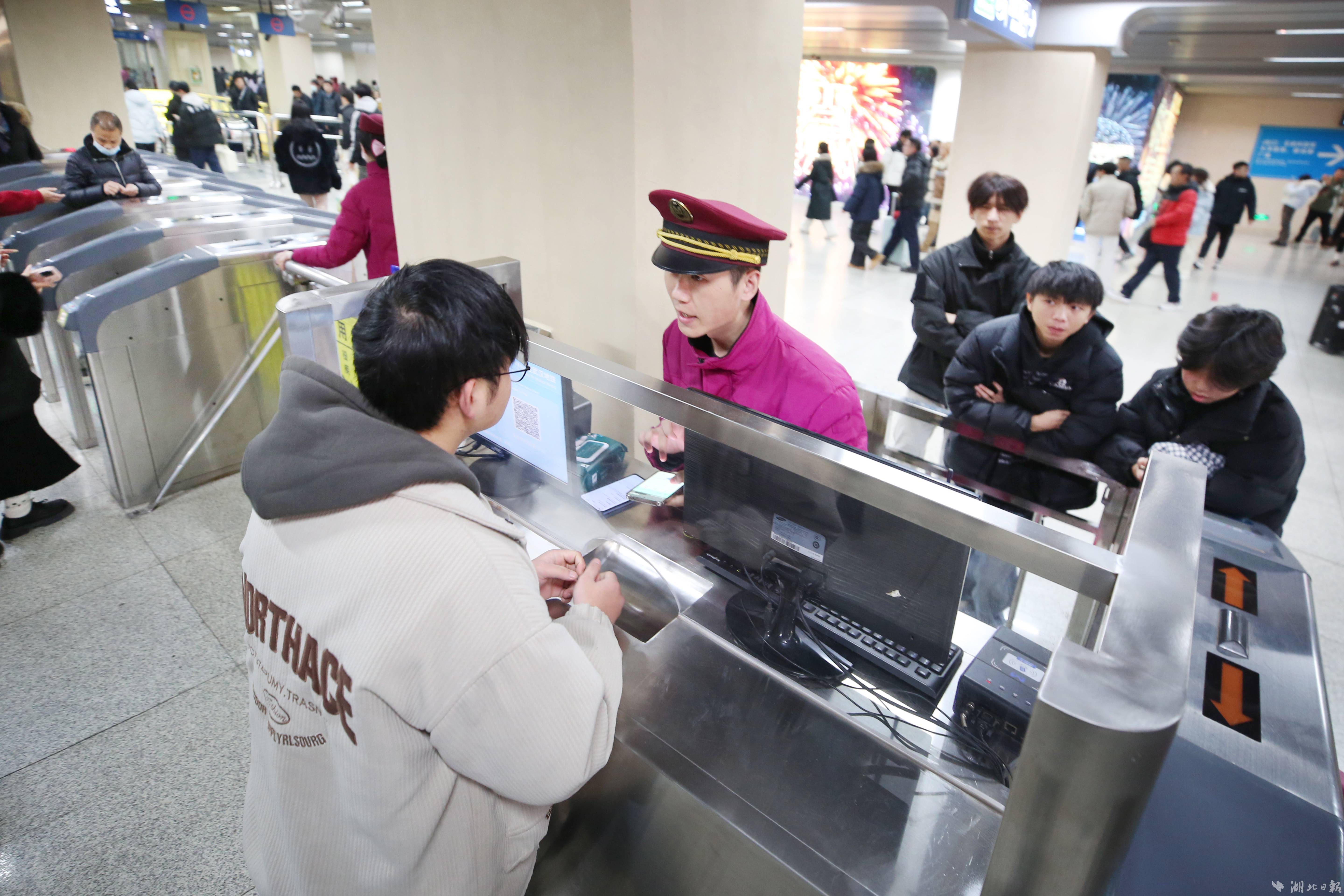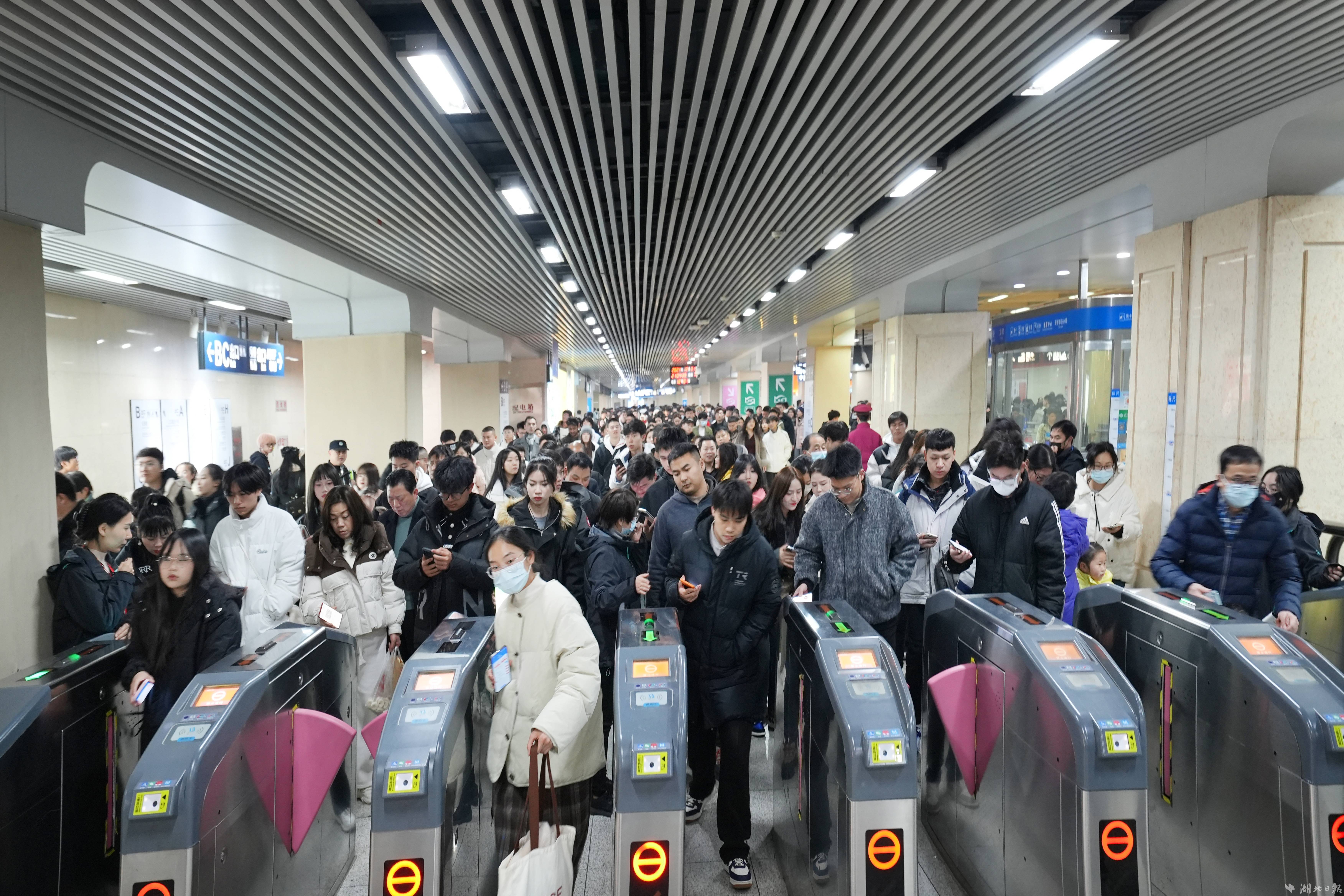 2024年跨年夜,武汉大批市民、游客涌向江汉关广场,使得江汉路地铁站迎来了两波客流小高峰:2024年12月31日客流量36.79万乘次,2025年1月1日客流量34.93万乘次。尤其是1月1日零点后,大批返程乘客集中进站,江汉路地铁站进站人数达到了单小时2万人次,相当于每2秒钟就要进11个人。2号线江汉路站站区负责人李莹介绍,为应对集中返程客流,全站只保留4组出站通道,其他30组闸机全部设为进站,且设置2处临时客服中心、5处安检点及无包快检通道。“因为应对有力,返程客流通行顺畅有序,未造成滞留与拥挤。”