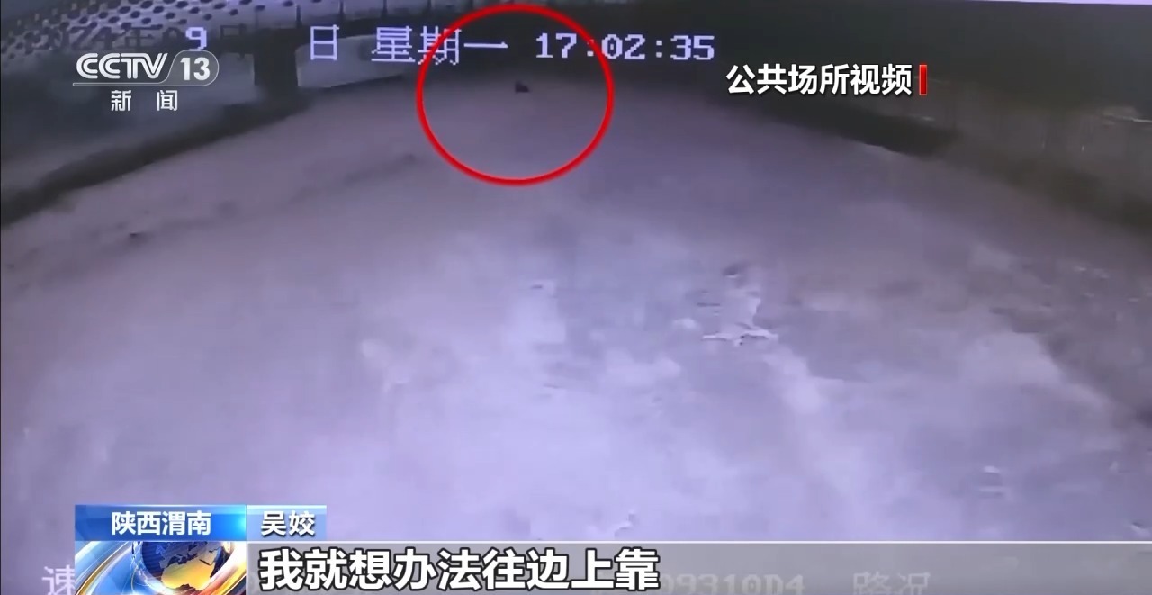 在另一角度的视频画面中可以看到,吴姣的身影随着水流快速地向下游冲过去,路面上没有任何物品可以让她抓住。