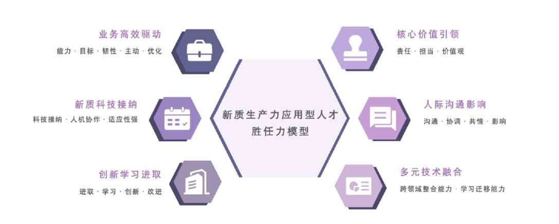 《报告》分析结果显示,新质生产力应用型人才(紫领人才)的胜任力模型由6个核心胜任力因子组成,它们分别是:业务高效驱动、新质科技接纳、创新学习进取、多元技术融合、人际沟通影响、核心价值引领。该模型的构建,不仅为个人提供了明确的职业发展路径指引,也为企业人才的招聘、培训和发展提供战略方向和方法指导。