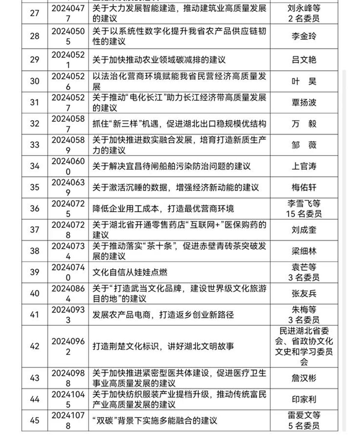 记者了解到,根据《中国人民政治协商会议湖北省委员会提案工作条例》和《政协湖北省委员会关于提高提案质量的实施办法》,湖北省政协每年开展好提案评选。经各方面推荐、专家评审、省政协提案委员会研究,省政协秘书长会议、主席会议审议通过,共评选出2024年度好提案45件,占年度提案总数的4%。
