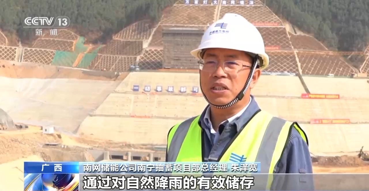 南网储能公司南宁抽蓄项目部总经理 朱泽宽:进入蓄水阶段,通过对自然降雨的有效储存,两个水库的蓄水总量可达到1300万立方米,接近一个西湖的水量。2025年,我们将协同推进电站水库蓄水和机组安装两大建设任务,实现机组安装1台、发电1台。