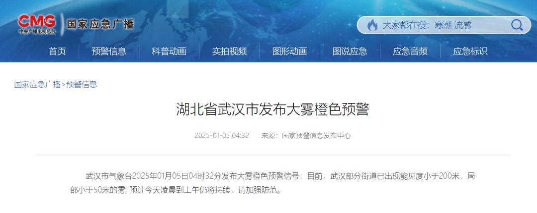 武汉市气象台2025年01月05日04时32分发布大雾橙色预警信号:目前,武汉部分街道已出现能见度小于200米,局部小于50米的雾, 预计今天凌晨到上午仍将持续,请加强防范。