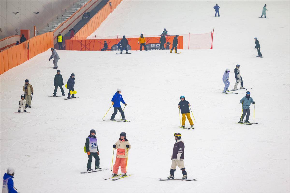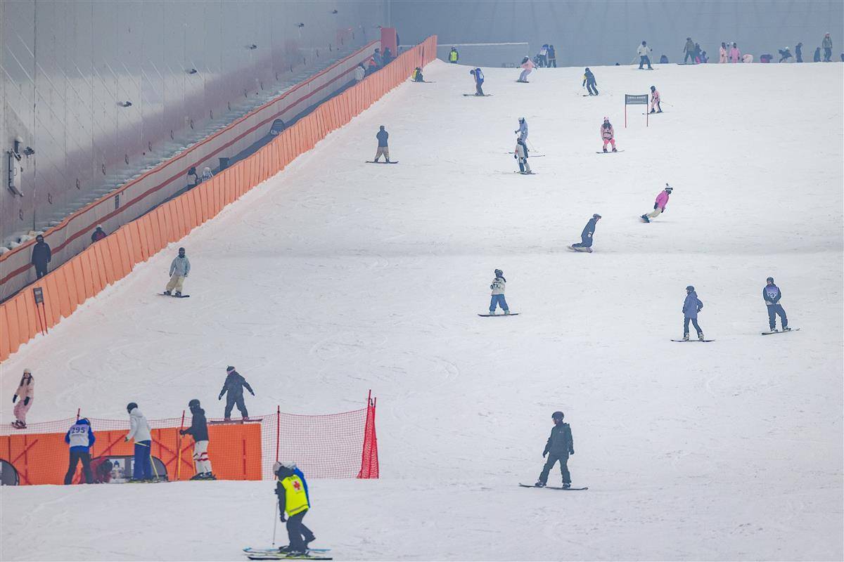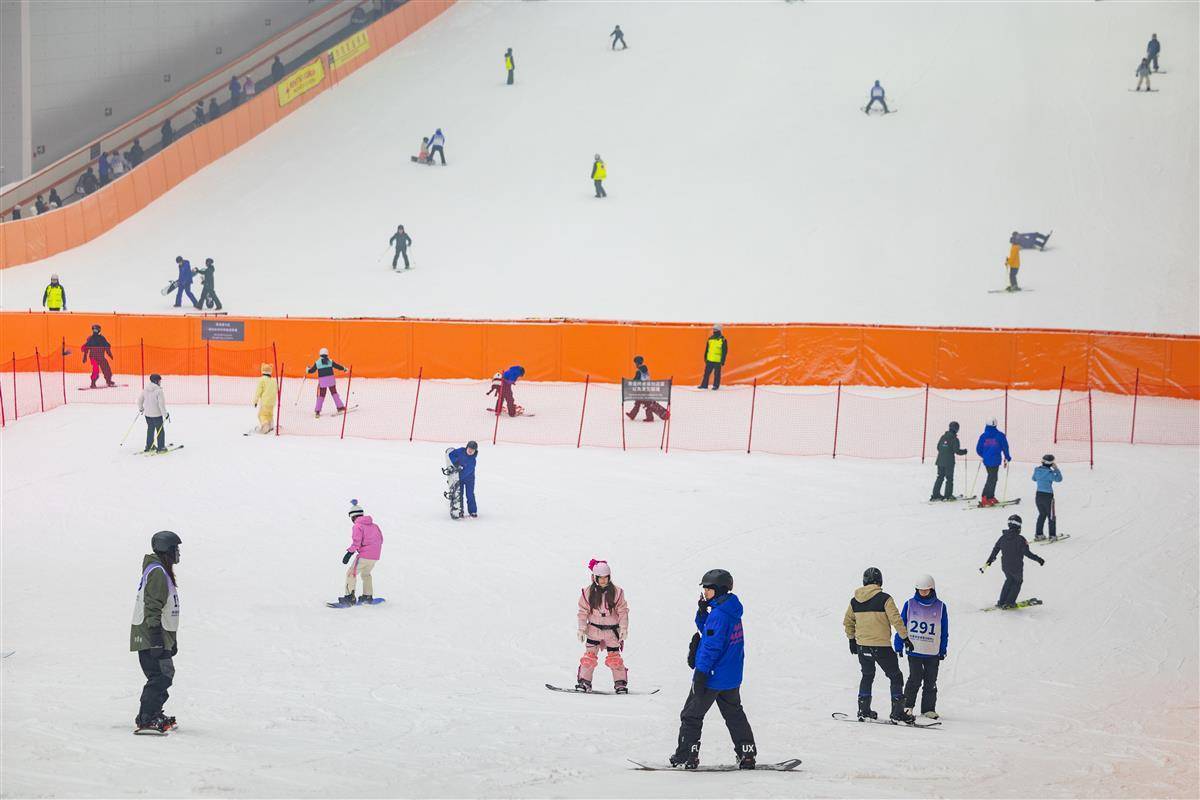 2025年1月4日,位于武汉市黄陂区的甘露山国际滑雪场内热闹非凡,滑雪爱好者们在滑道上驰骋感受冰雪魅力。据介绍,近日启幕的武汉大众冰雪季持续火热,作为华中最大、全国第三,世界第七的超大室内滑雪场甘露山国际滑雪场,吸引了全国各地雪友来汉滑雪,也让武汉人滑雪的热情更加高涨,周末客流突破2000人。除了滑雪、娱雪,“吃喝玩乐住”也可在此一站式满足,冰雪经济链条不断延伸。