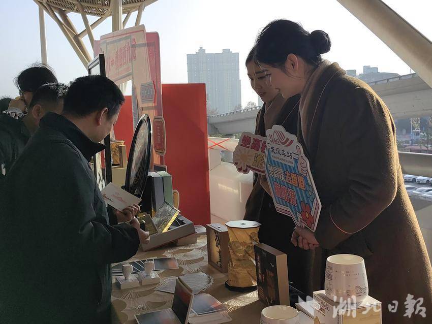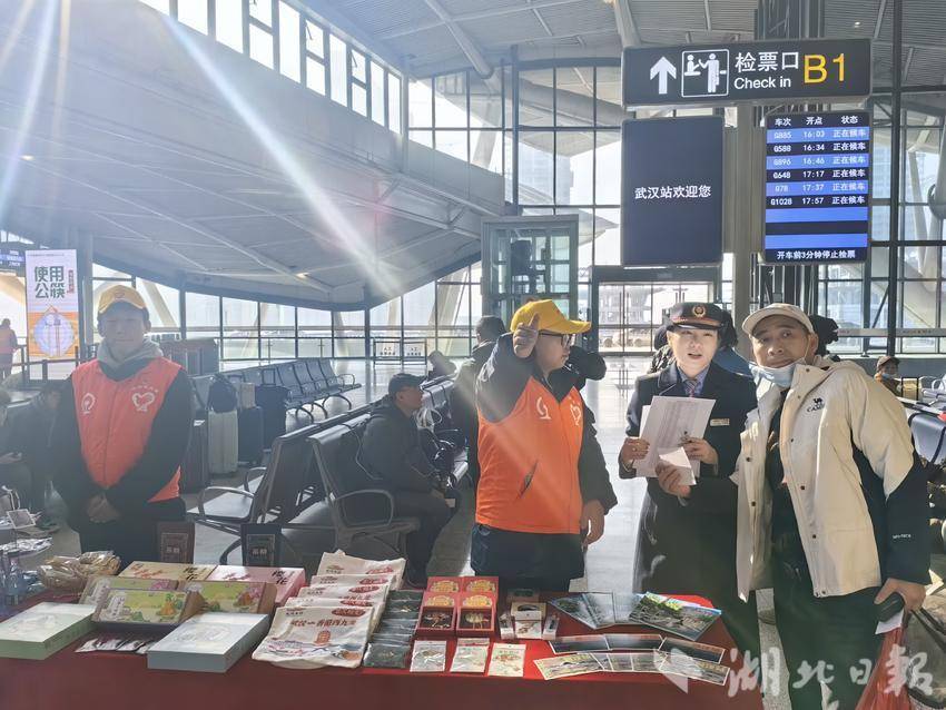 下午2:30,在G885次候车区,头戴小黄帽、身穿荧光橙马甲的志愿者们正忙着往展台上摆放零食点心、文旅宣传册和铁路文创品。