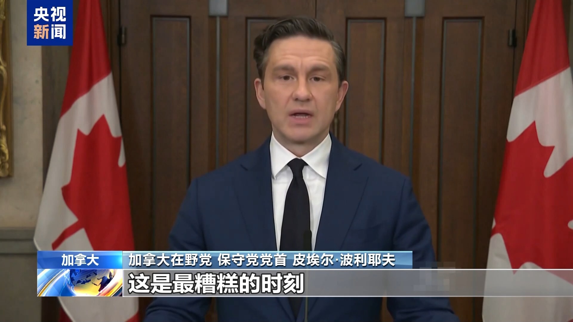 加拿大在野党保守党党首 皮埃尔·波利耶夫:我们看到加拿大政府自身陷入了失控螺旋,就发生在我们眼前,这是最糟糕的时刻。