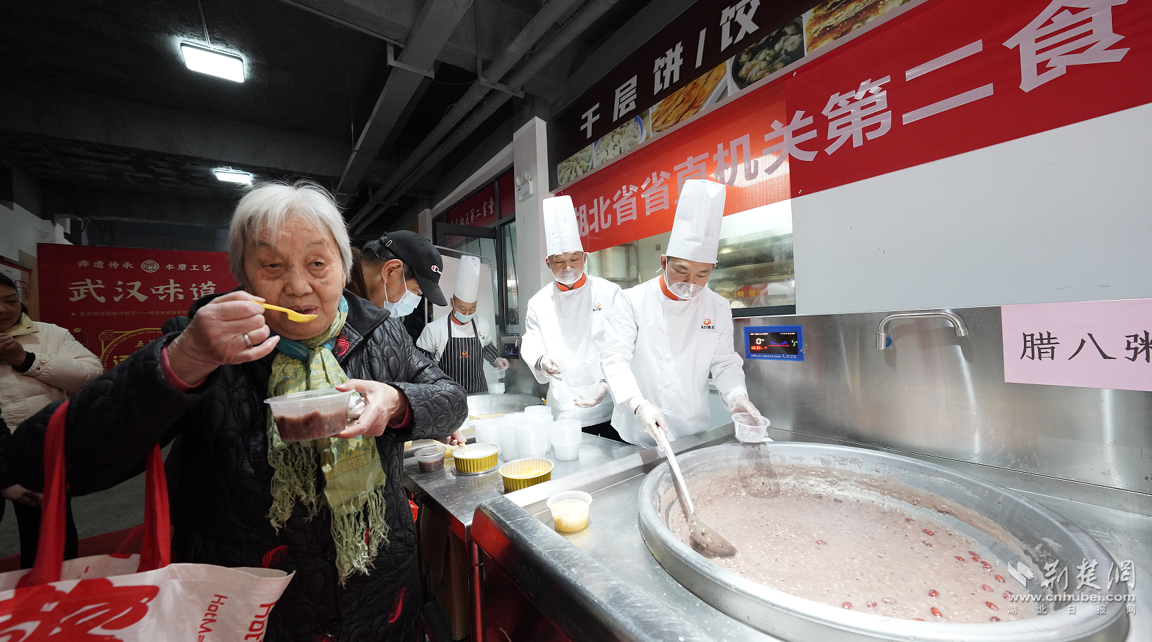 荆楚网(湖北日报网)讯(记者张扬)1月7日是中国传统节日腊八节,湖北省直机关二食堂的一家非遗餐厅精心准备了腊八粥和非遗滑肉,邀请附近居民喝腊八粥,庆祝腊八节。