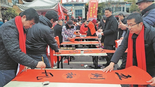楚天都市报极目新闻讯(记者张艳 通讯员 王旭 曾博文)1月7日是腊八节,在襄阳市谷城县五山镇堰河村广场上,2025年墨润荆楚“乡村书法潮”启动仪式暨湖北省书协“万福迎春”写春联、送福字活动举行。来自省、市、县的60余位书法名家们,饱含祝福挥毫泼墨、笔走龙蛇,为村民和游客们写下一个个福字、一副副对联,并联袂完成一幅百米长卷的书法作品。游客络绎不绝,村民穿梭其间,浓浓的年味儿在乡间四溢。