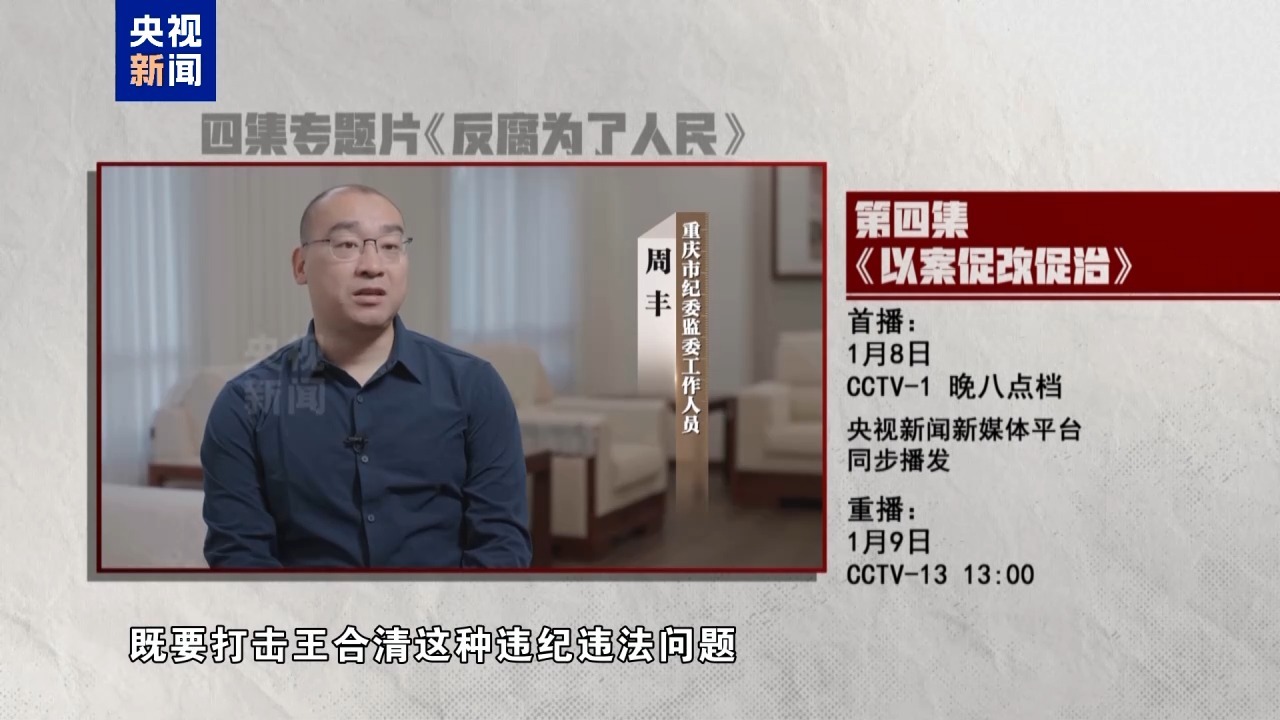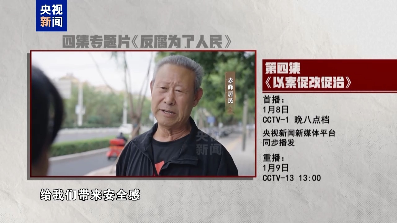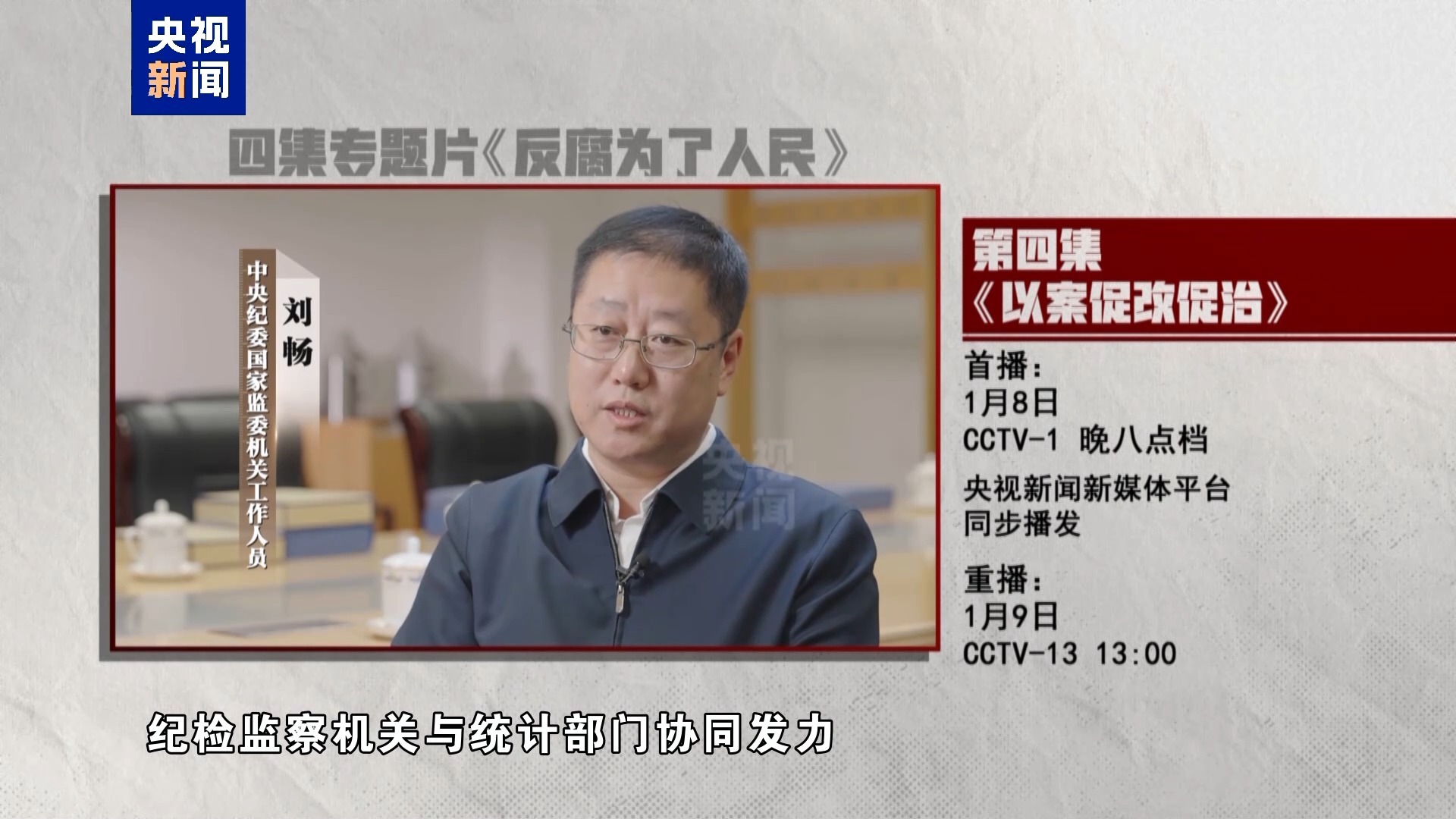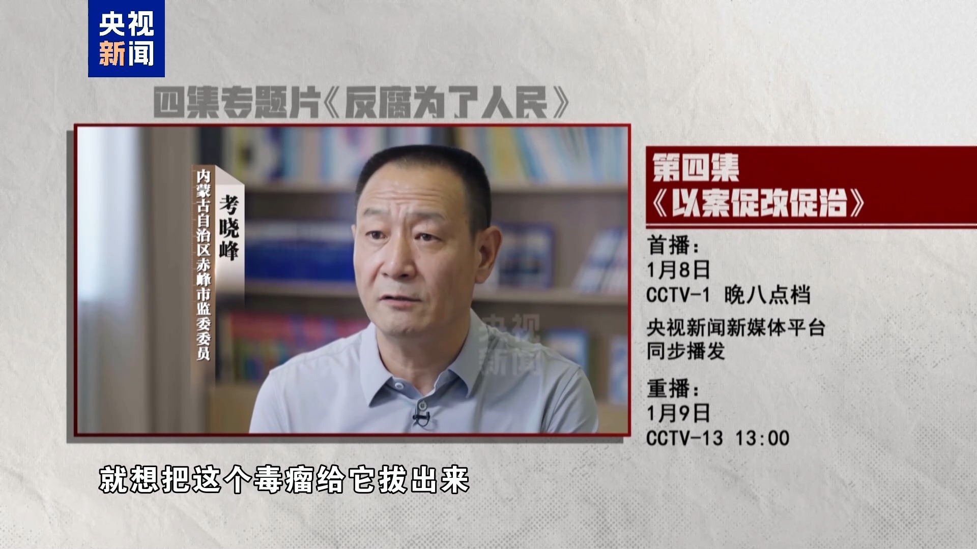 电视专题片《反腐为了人民》第四集《以案促改促治》,讲述纪检监察机关深化探索“三不腐”贯通融合的有效载体,以正风肃纪反腐强化“不敢”、以健全制度机制促进“不能”、以思想政治教育激发“不想”,从个案查处到系统治理全面发力,深化以案促改、以案促治,着力铲除腐败滋生的土壤和条件。央视综合频道1月8日晚8点档播出,央视新闻新媒体平台同步播发,敬请关注。