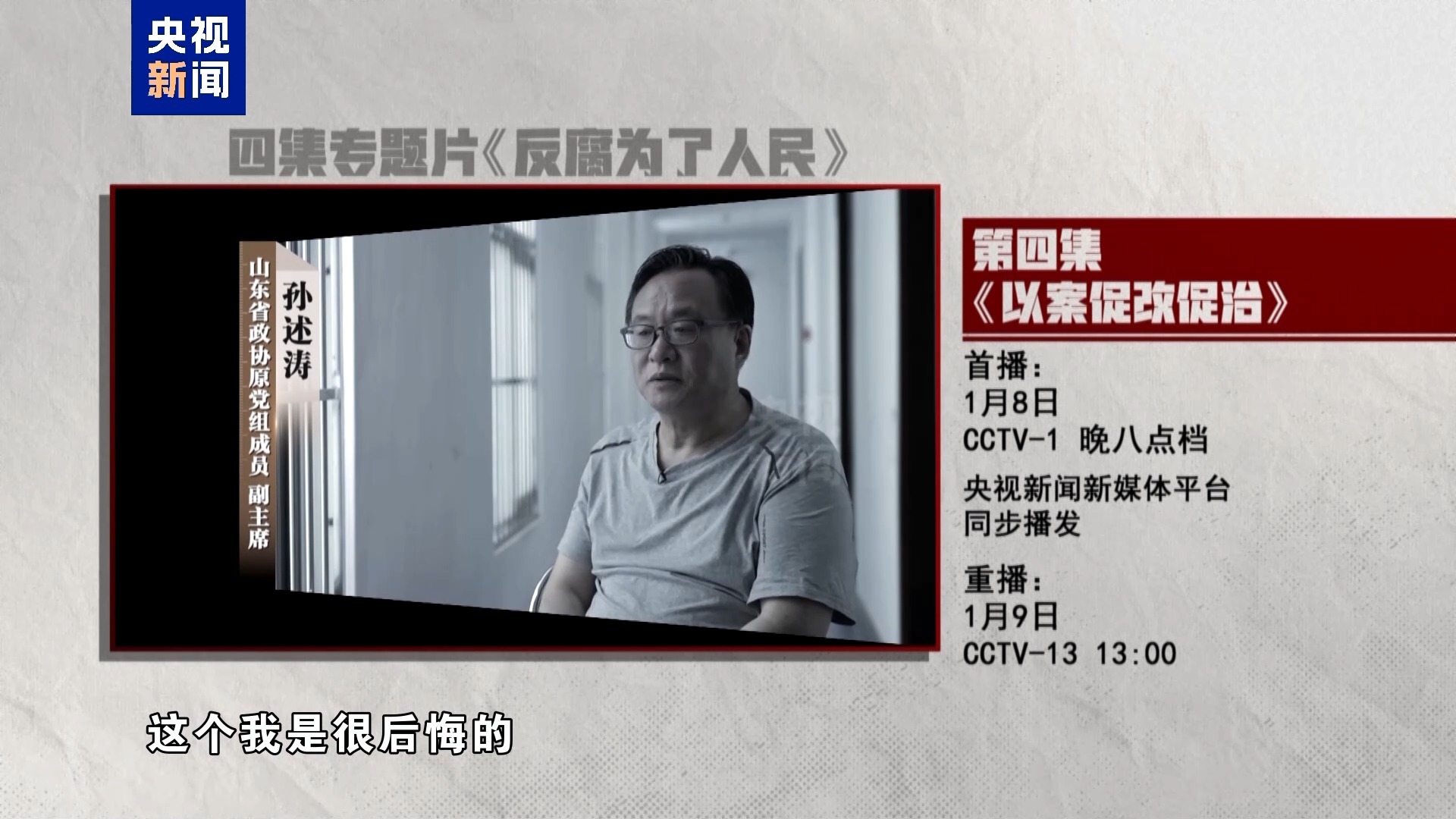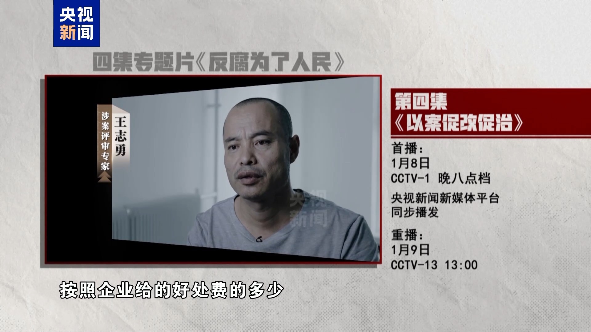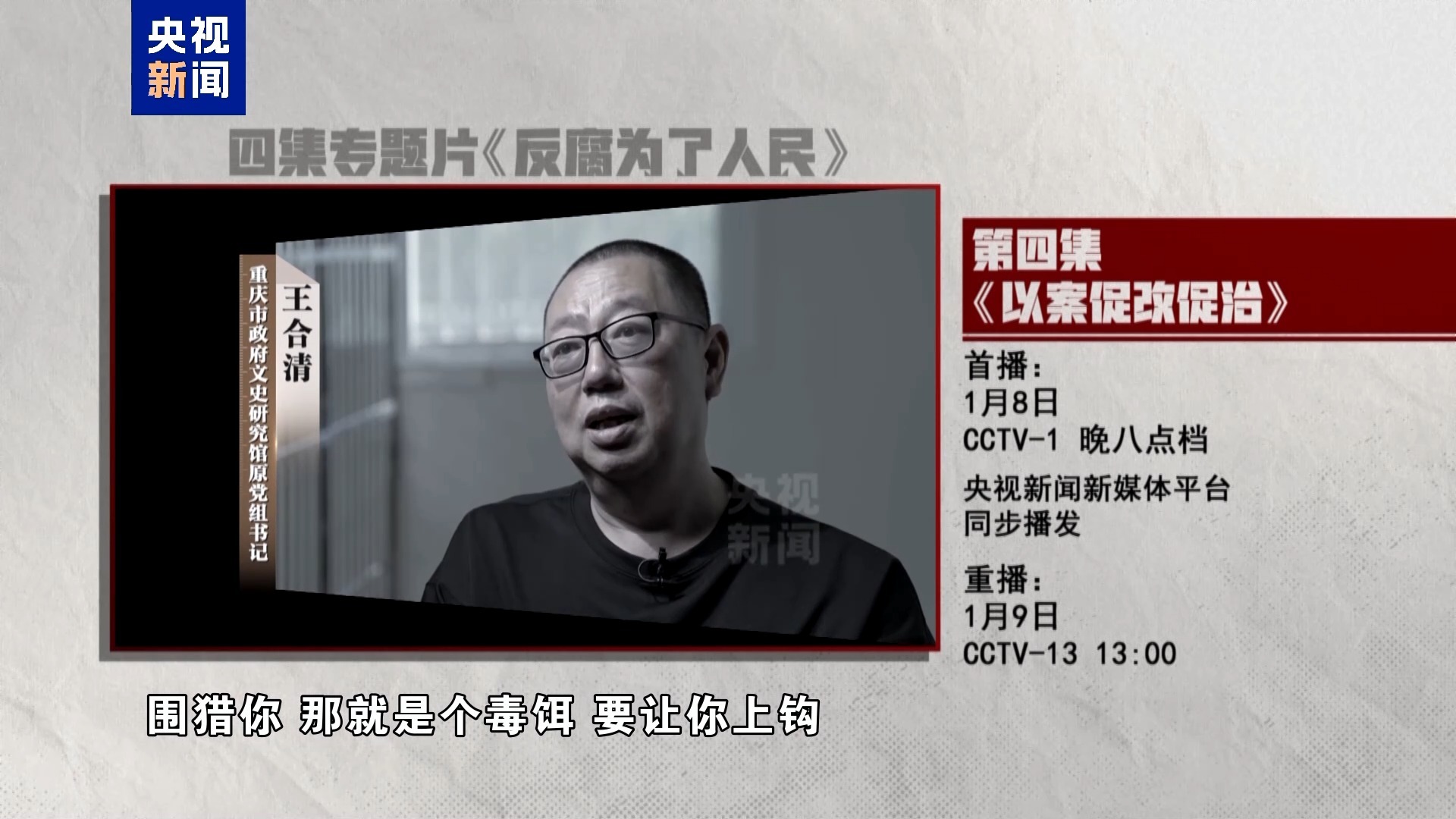 电视专题片《反腐为了人民》第四集《以案促改促治》,讲述纪检监察机关深化探索“三不腐”贯通融合的有效载体,以正风肃纪反腐强化“不敢”、以健全制度机制促进“不能”、以思想政治教育激发“不想”,从个案查处到系统治理全面发力,深化以案促改、以案促治,着力铲除腐败滋生的土壤和条件。央视综合频道1月8日晚8点档播出,央视新闻新媒体平台同步播发,敬请关注。