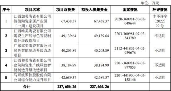 马可波罗拟在深交所主板募集资金237,656.26万元,分别用于江西加美陶瓷有限公司智能陶瓷家居产业园(一期)建设项目、江西唯美陶瓷有限公司陶瓷生产线绿色智能制造升级改造项目、广东家美陶瓷有限公司绿色智能制造升级改造项目、江西和美陶瓷有限公司建筑陶瓷生产线绿色智能制造升级改造项目、马可波罗控股股份有限公司综合能力提升项目。