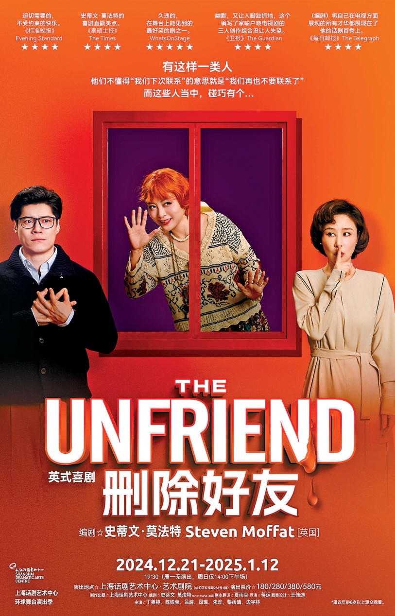 当“社交悍匪”大刀阔斧地闯入你的生活,礼貌的社交辞令还能抵挡得住吗?上海话剧艺术中心正在上演的英式喜剧《删除好友》中文版,以幽默形式探索了隐藏在日常社交下的幽微。