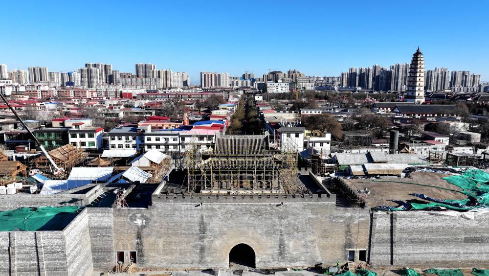 ↑这是1月8日拍摄的正在修缮中的定州南城门(无人机照片)。