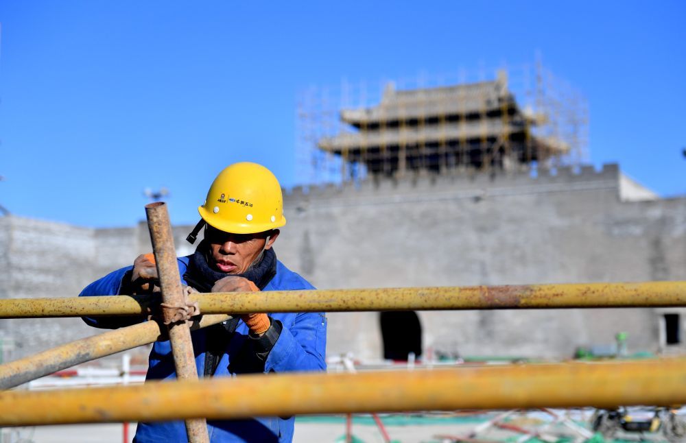 ↑1月8日,施工人员在定州南城门施工现场进行作业。