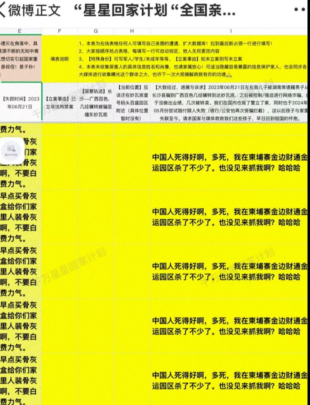 戴小姐称,9日上午她决定通过微博公开在线文档填写地址后,填写求救信息的家属快速增长,至被关停前已接近500人。文档内的骚扰信息则出现于当天15时左右,她怀疑这些留言骚扰的人与电诈园区有关。