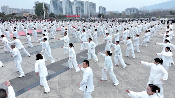 众多太极拳爱好者现场习练太极拳。