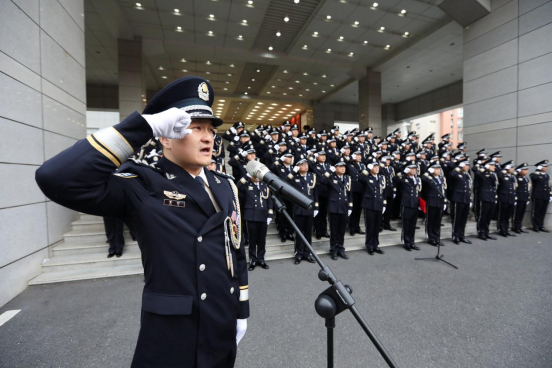 1月7日清晨8时28分,东湖高新分局大院内气氛庄重而热烈。分局精心筹备的警旗升旗仪式在这里隆重举行,分局党委成员、各科所队站领导及功模民警代表等近80人参加。