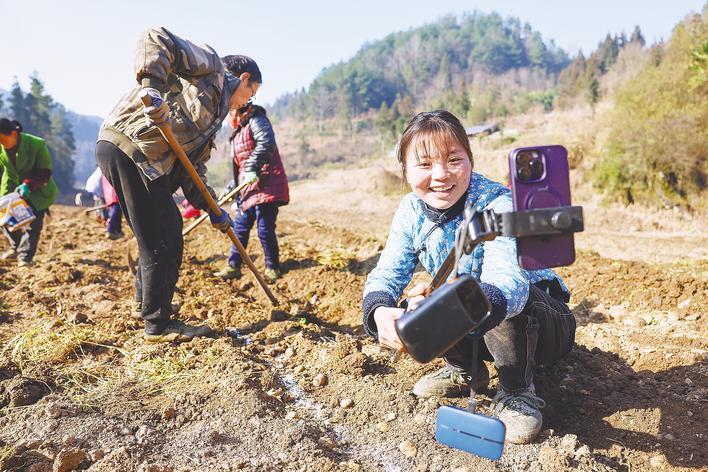 黄柳公司培养的主播在田间直播村民种土豆。(湖北日报通讯员 杜迪纳 摄)