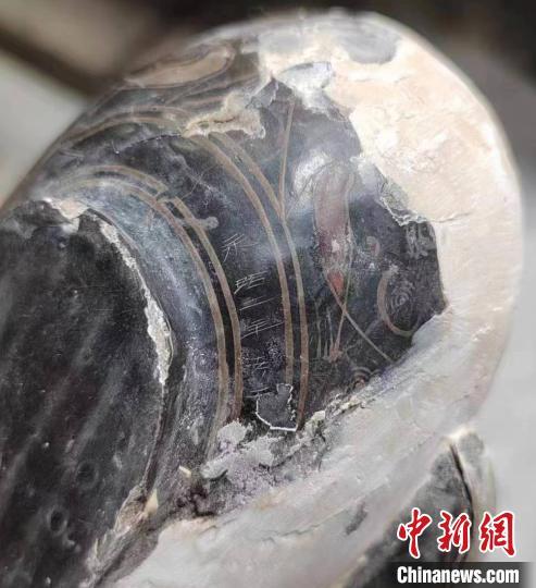 2024年8月5日,湖北襄阳出土的纪年漆耳杯锥刻的半圈隶书长铭。(襄阳市文物考古研究所 供图)