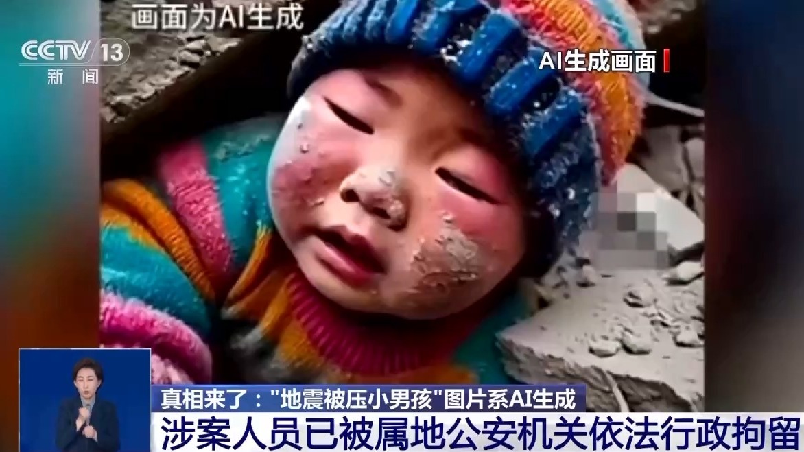 记者昨天(10日)从公安部网安局了解到,鉴于该图片存在明显AI生成痕迹,公安机关网安部门迅速开展核查,经查,上述图片确由AI工具创作,原作者在2024年11月18日发布了相同画面的短视频,并未关联地震且声明是AI生成。经查,青海某网民为博取眼球,将“小男孩被埋图”与日喀则地震相关的信息进行关联拼凑、移花接木、混淆视听、误导群众,致使谣言信息传播扩散。目前,该涉案人员已被属地公安机关依法行政拘留。