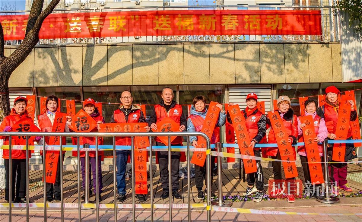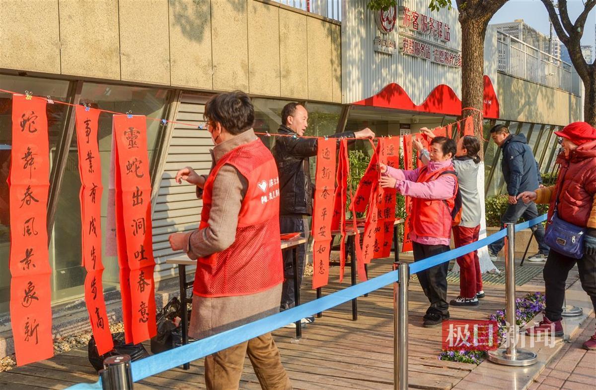 “免费领春联喽”“送福喽”……极目新闻记者在现场看到,志愿者们热情地邀请往来游客参与活动,不少晨练的市民欣喜地凑上前来,挑选心仪的春联和年福,字体看中眼的、内容合心意的,通通收入囊中。