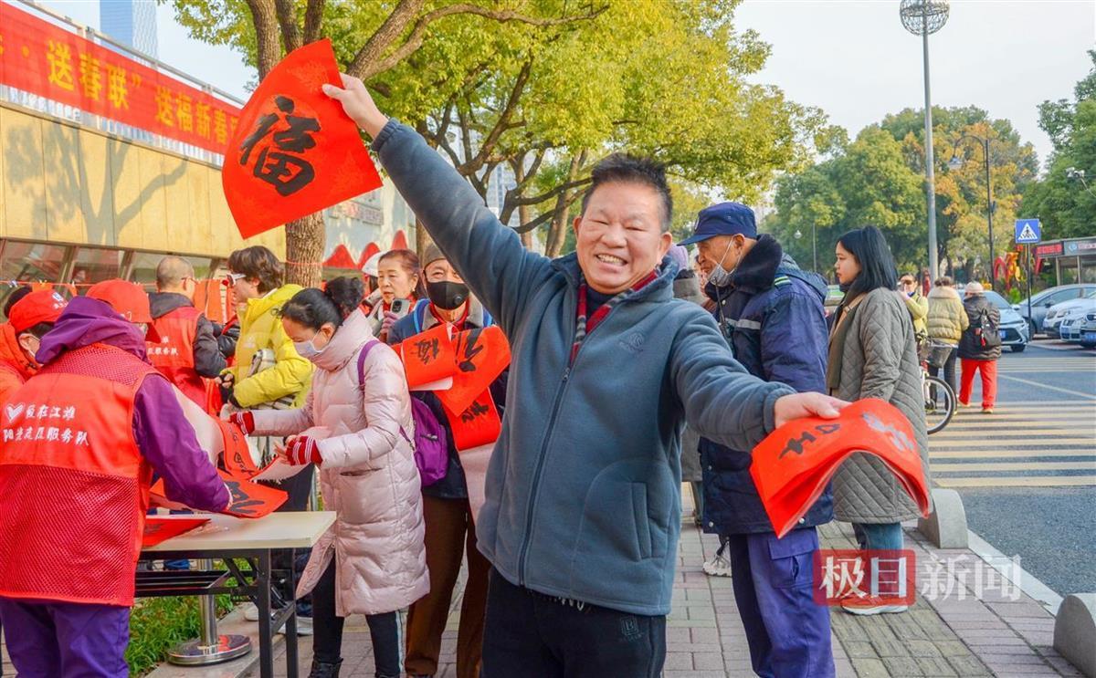 极目新闻记者了解到,这是武汉市江滩管理办公室联合武汉地书协会,连续第12年向市民游客免费赠送春联和年福,汉口、武昌和汉阳三地江滩同步开展。