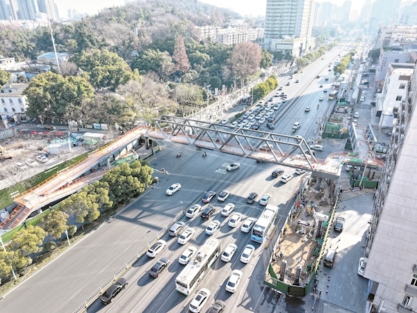 1月10日,武昌车流量最大的道路之一武珞路与丁字桥路交会处,一座在建过街人行天桥的钢结构主体基本完工,两端均设置了方便行人及电动车通行的缓坡。据了解,该天桥武珞路主桥长约51米,丁字桥路主桥长约28.5米。楚天都市报极目新闻记者宋枕涛摄