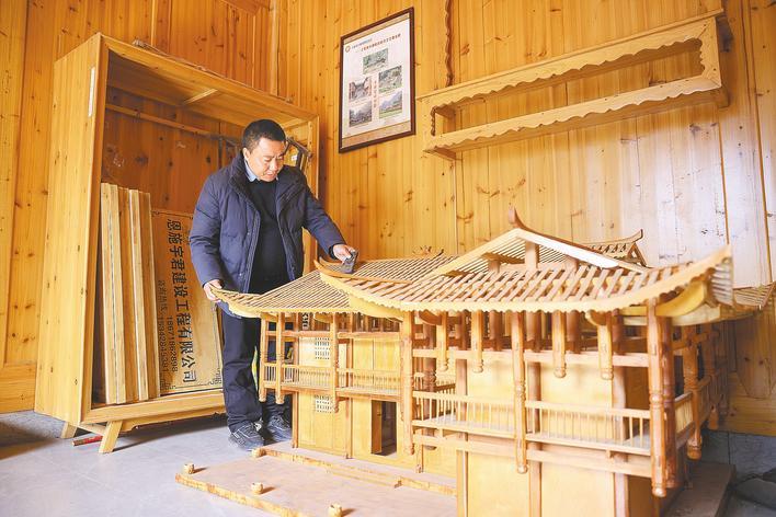 贺茂宣介绍土家吊脚楼模型。 (湖北日报全媒记者 鲁腾 通讯员 杜迪纳 摄)
