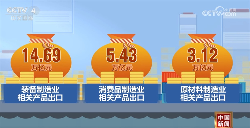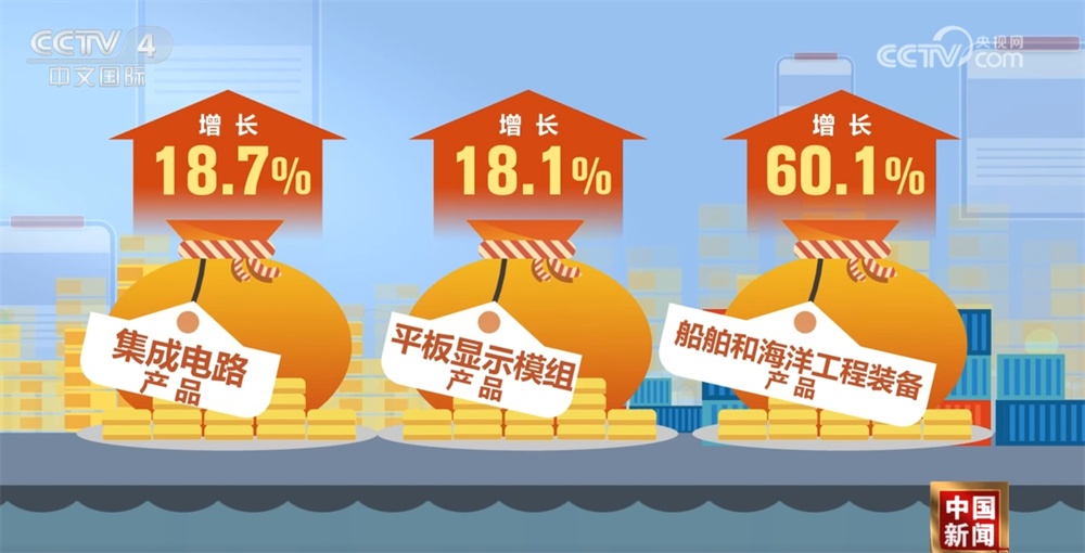 2024年中国对外贸易亮点不断涌现:中国是全球制造业第一大国,也是制造业第一大出口国。2024年,制造业占中国出口总值的98.9%,装备制造业、消费品制造业、原材料制造业相关产品分别出口14.69万亿元、5.43万亿元、3.12万亿元。其中,集成电路、平板显示模组、船舶和海洋工程装备等产品分别增长18.7%、18.1%、60.1% ,尤其是代表“大国重器”的高端制造业——大型船舶制造和出口表现亮眼。