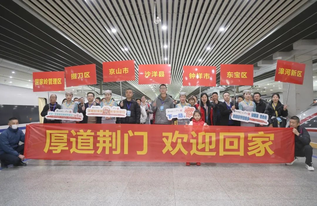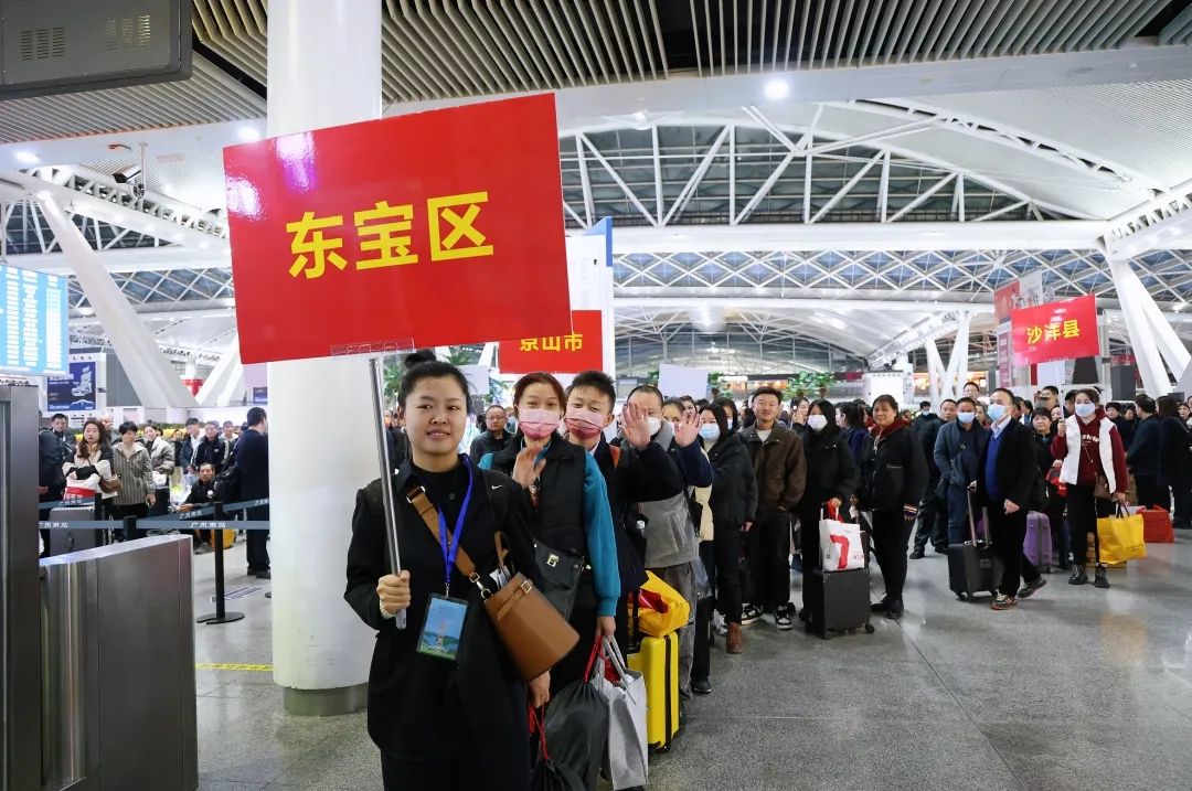 12日14时,搭乘专列的返乡人员来到荆门西站东广场,湖北省2025年“春风行动”启动仪式暨“接您回家”招聘会活动在这里举行。