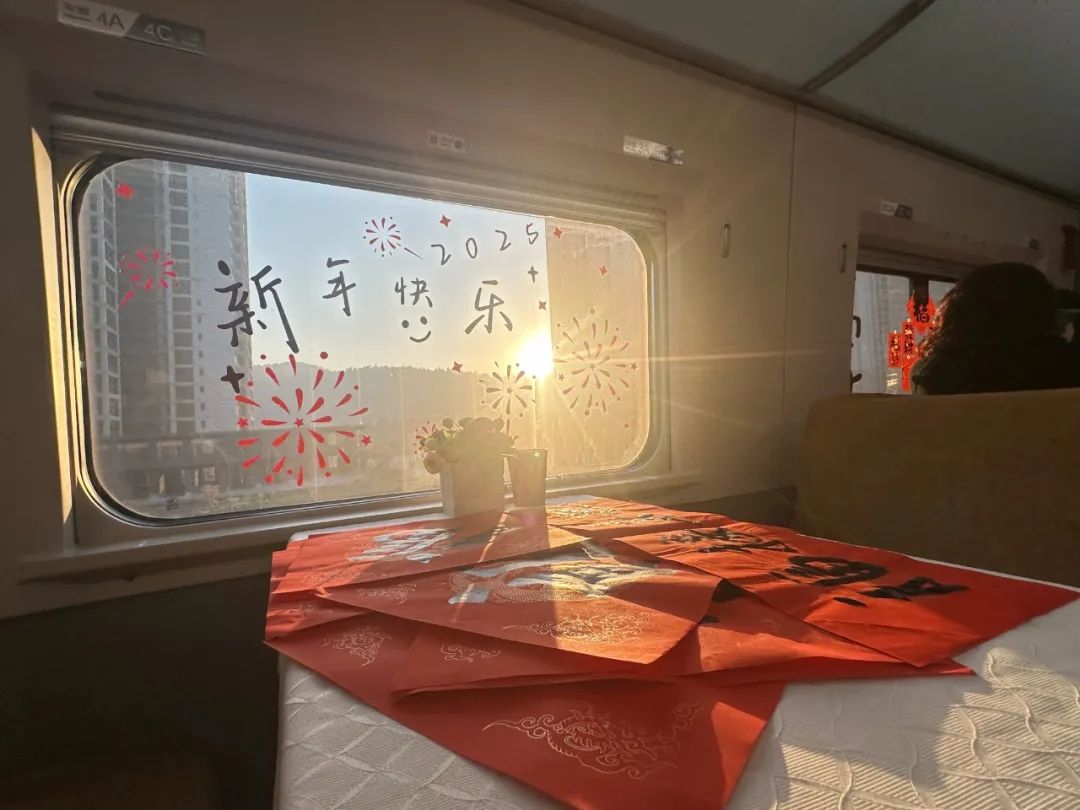 晨曦透过车窗洒满车厢,金色的光线仿佛为归乡旅途镀上了一层温暖的柔光,窗上的“新年快乐”几个字在阳光下格外醒目,为返乡旅客增添了一丝喜庆的氛围。