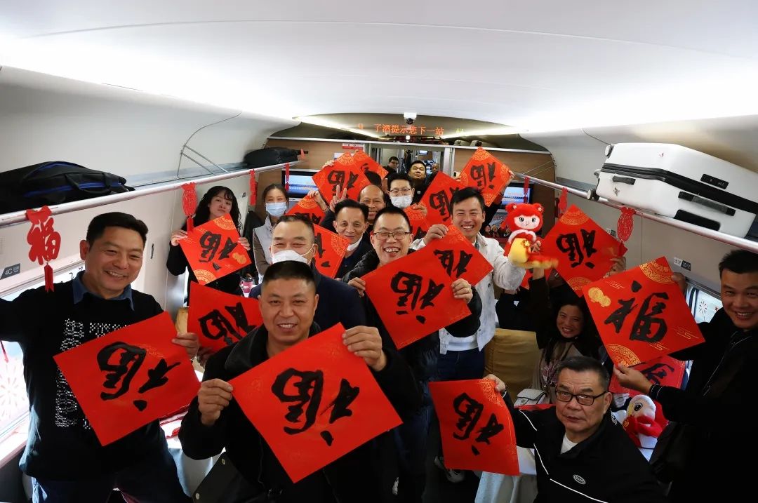 “过年嘛,家里贴上‘福’字和春联才有年味!”书法爱好者铺开红纸,挥毫泼墨,一个个“福”字在笔下生动跃然。一旁等待领取的旅客们排成长队,脸上洋溢着笑容。